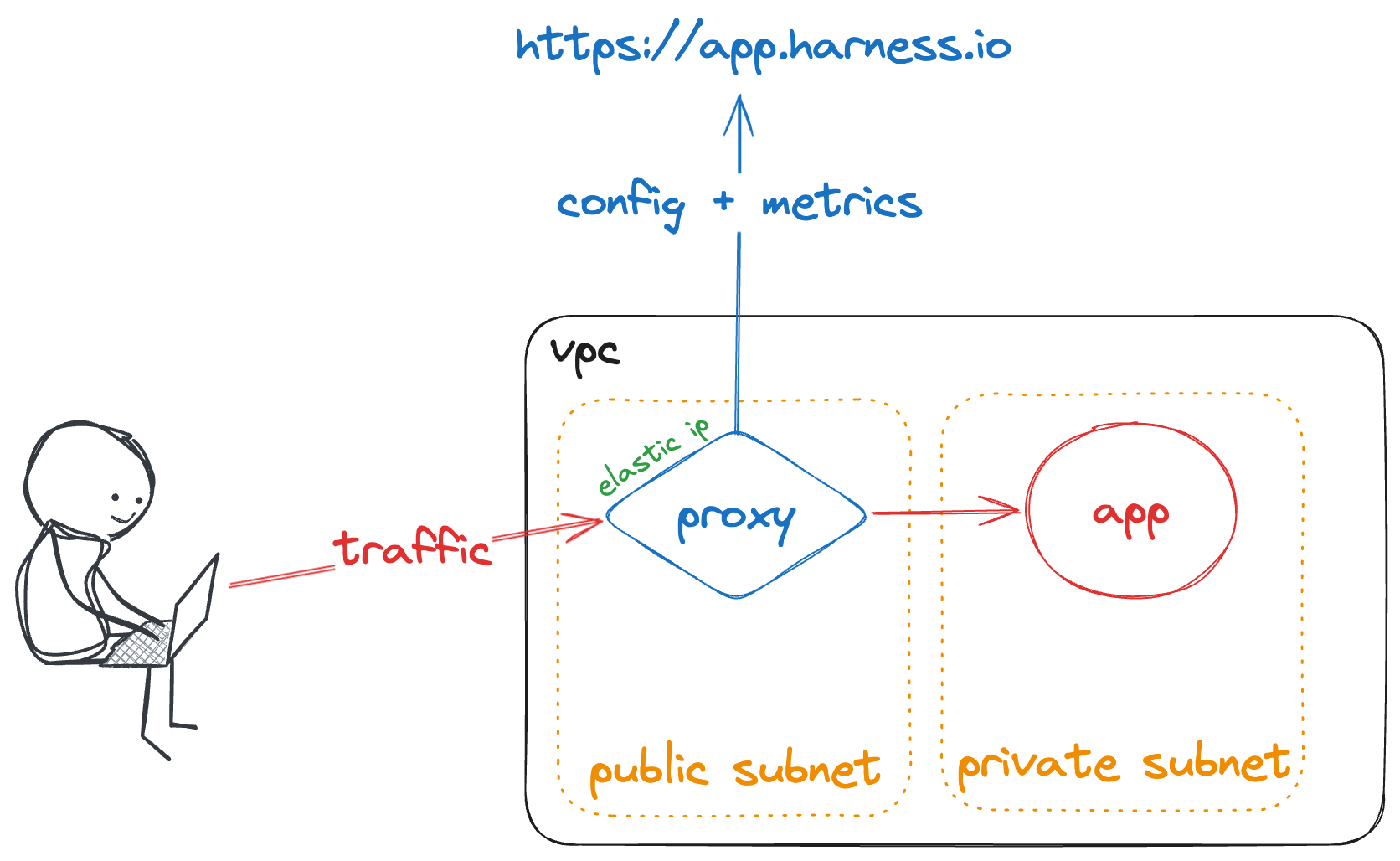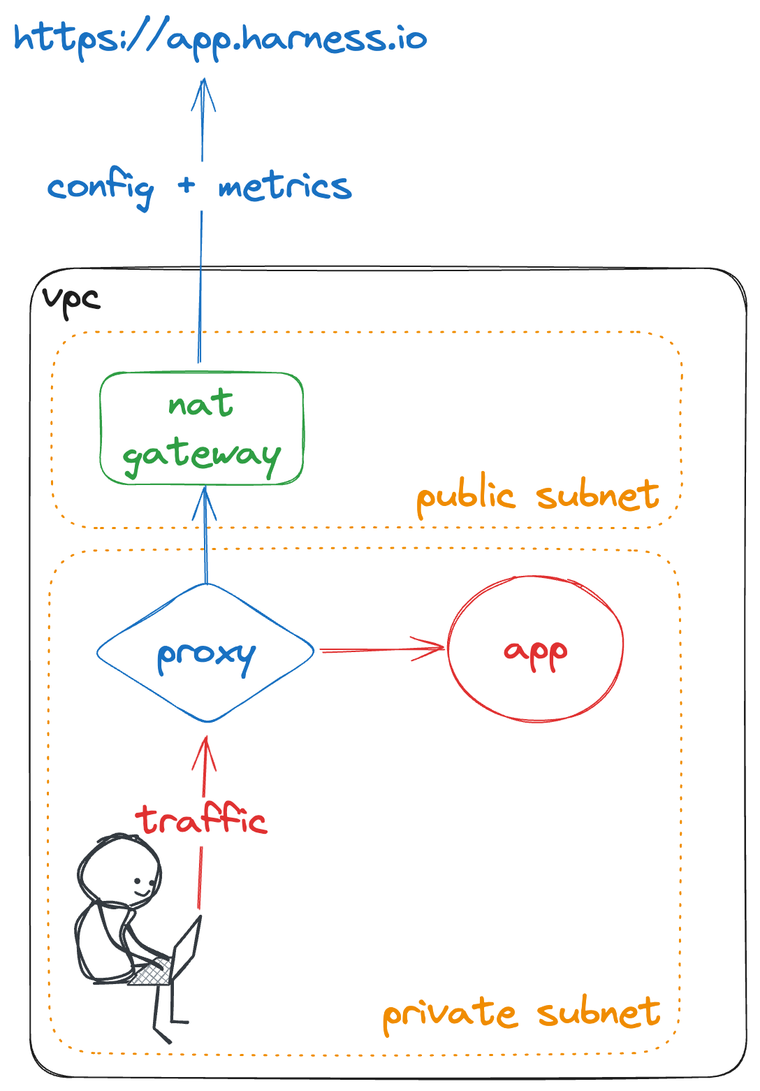 In both cases the proxy needs access to the internet. It uses this access to be initialized when first provisioned (download envoy), receive updates from Harness (new rules being created), and pass back usage metrics and activity for rules.
