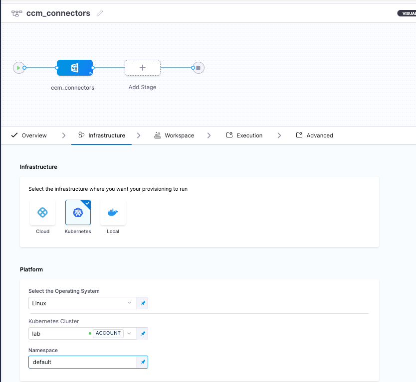 1. Add a new stage. Select Infrastructure as the stage type and name the stage ccm_connectors