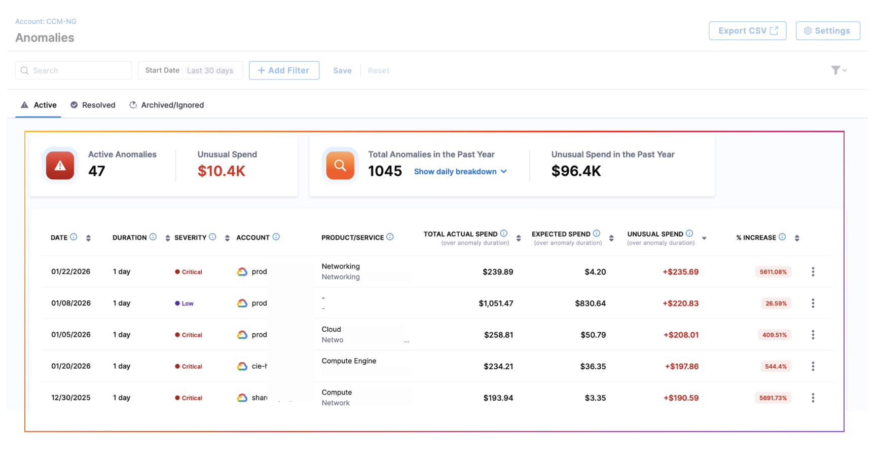 CCM also offers an advanced feature under a feature flag for AWS, GCP, and Azure that enables real-time anomaly detection: