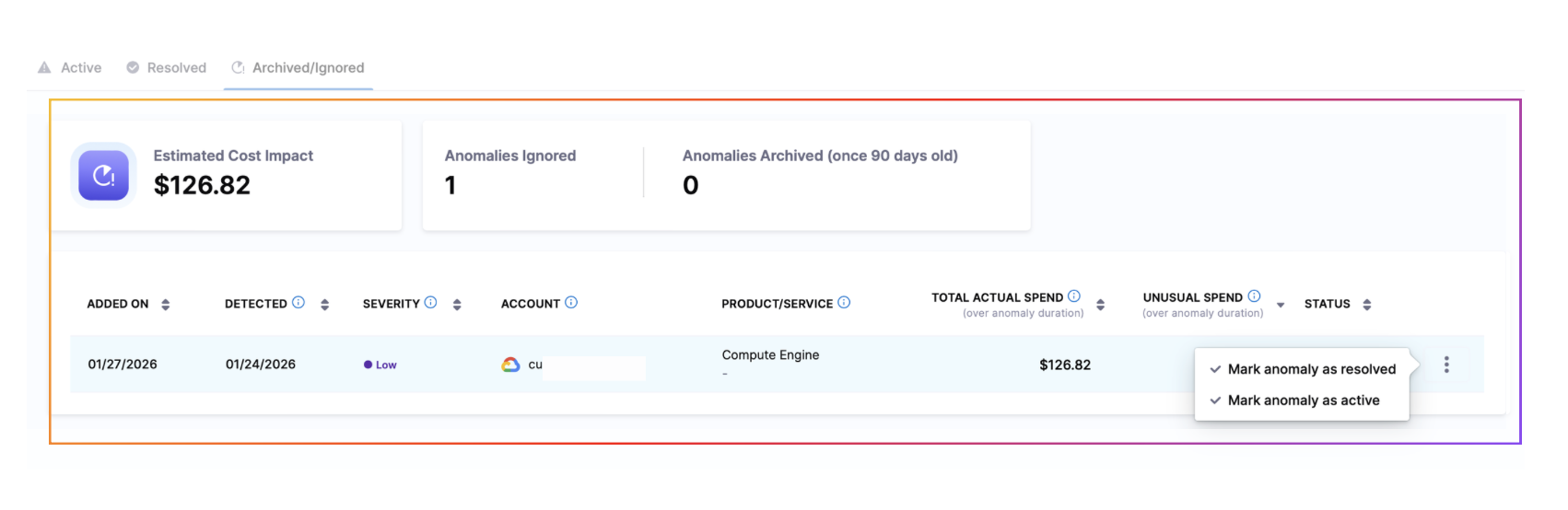 • Ignore Anomaly: Move the anomaly to the Archived/Ignored tab