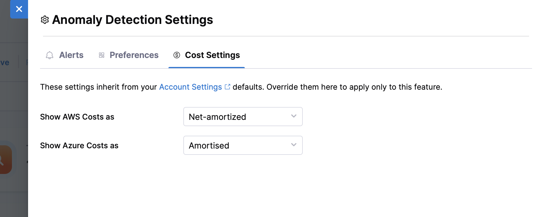 Overriding these settings here will only affect how costs are displayed in the anomaly detection feature and will not change your global account settings.