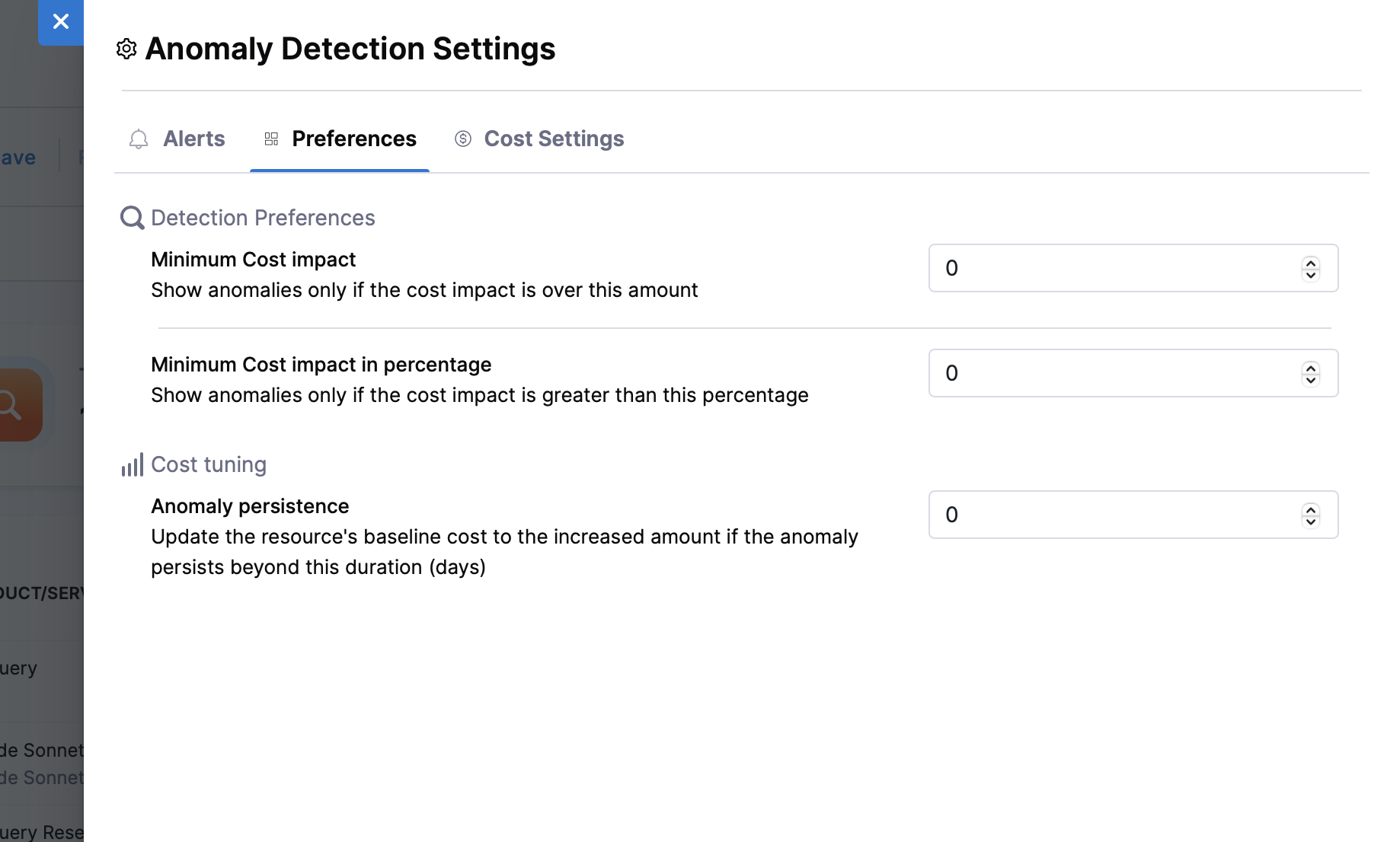 1. Minimum Cost Impact (Amount): This setting allows you to set a threshold for the cost impact in USD, meaning that anomalies will only be shown if the financial impact exceeds the specified amount.