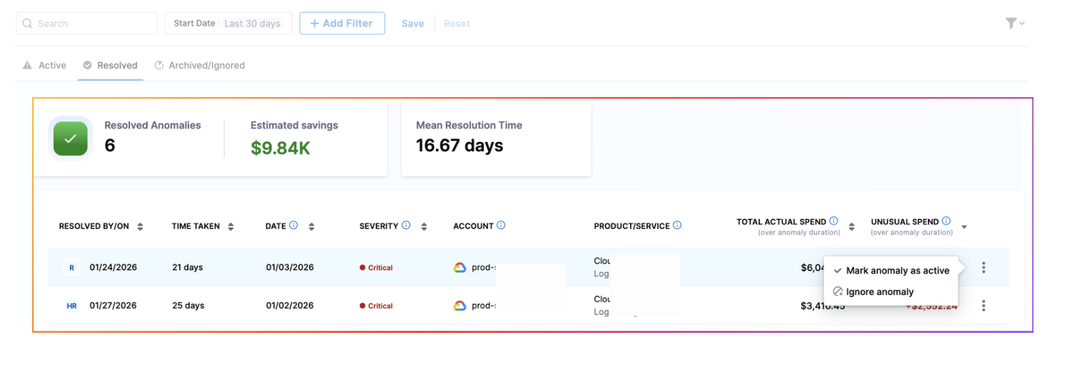 • Mark Anomaly as Resolved: Move the anomaly to the Resolved tab