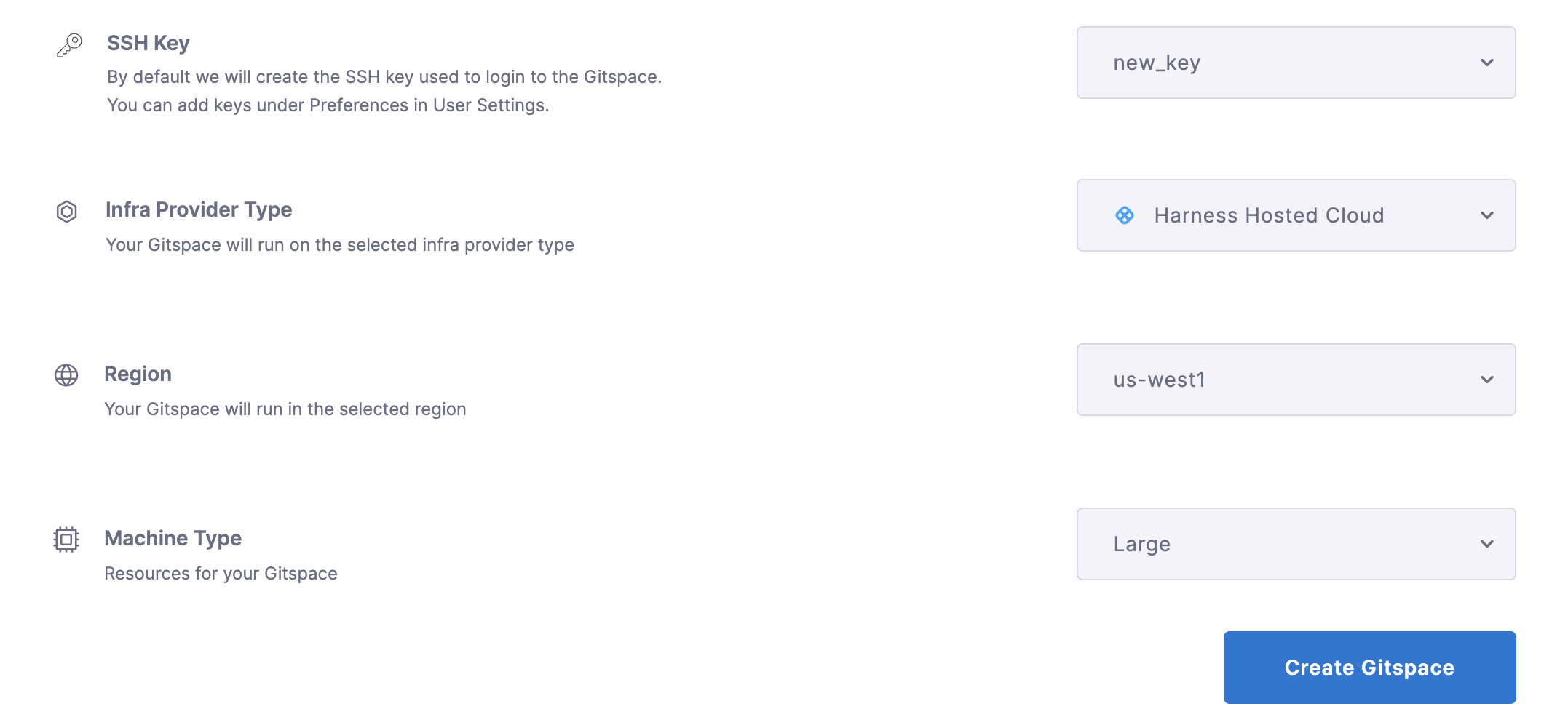 Add your SSH key and configure the required Gitspace specifications.