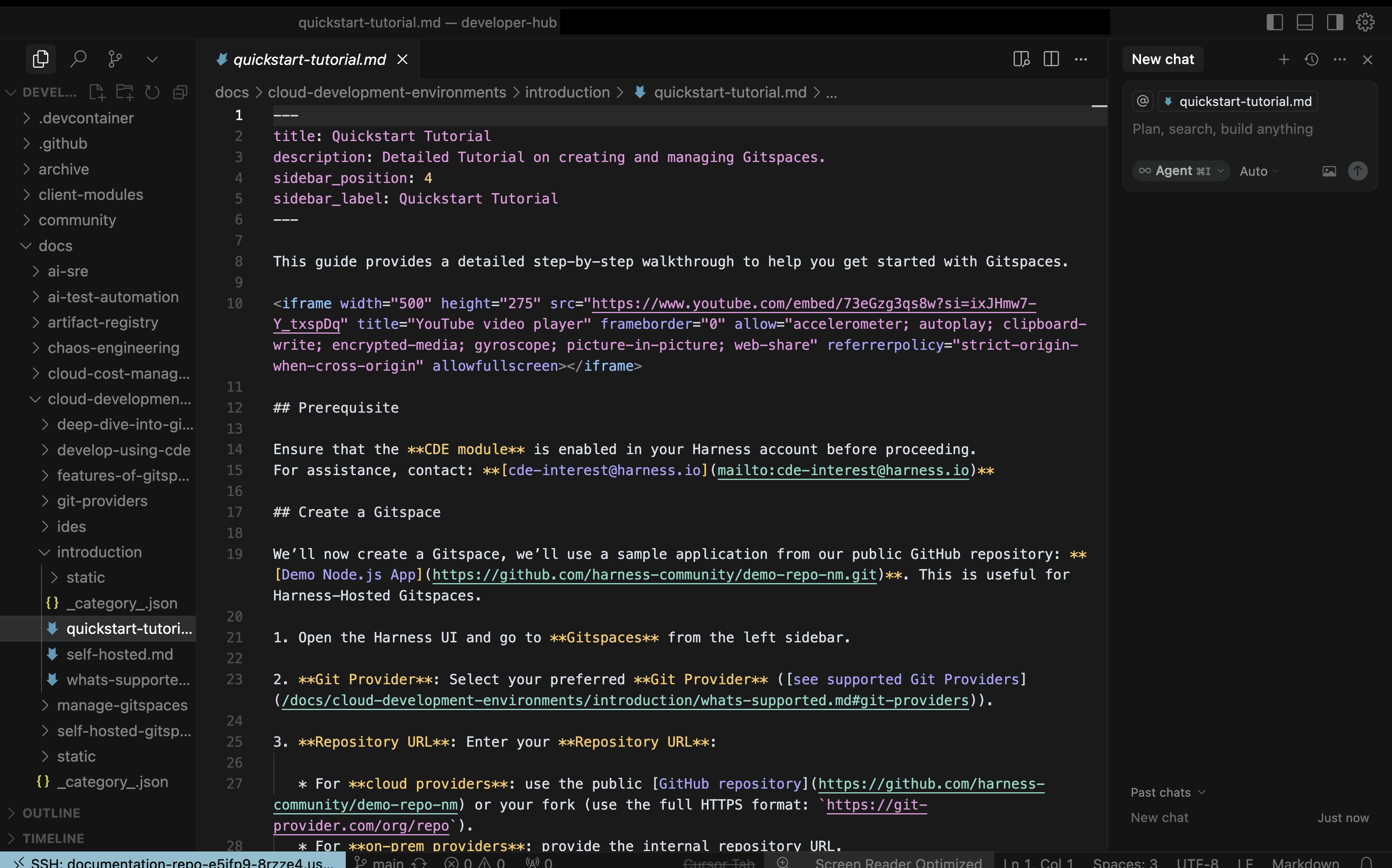 With Cursor support, Harness CDE enables seamless and efficient remote development in your Gitspaces within your Cursor IDE. This enables you to use Cursor and agentic AI features to enhance your remote development experience.