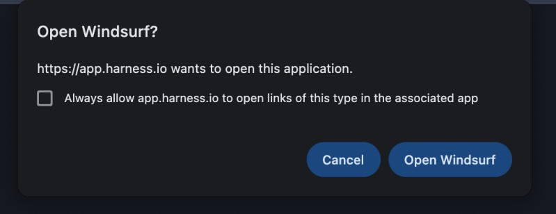 2. A prompt will appear requesting permission for app.harness.io to open Windsurf and establish a connection. Click on Open Windsurf.