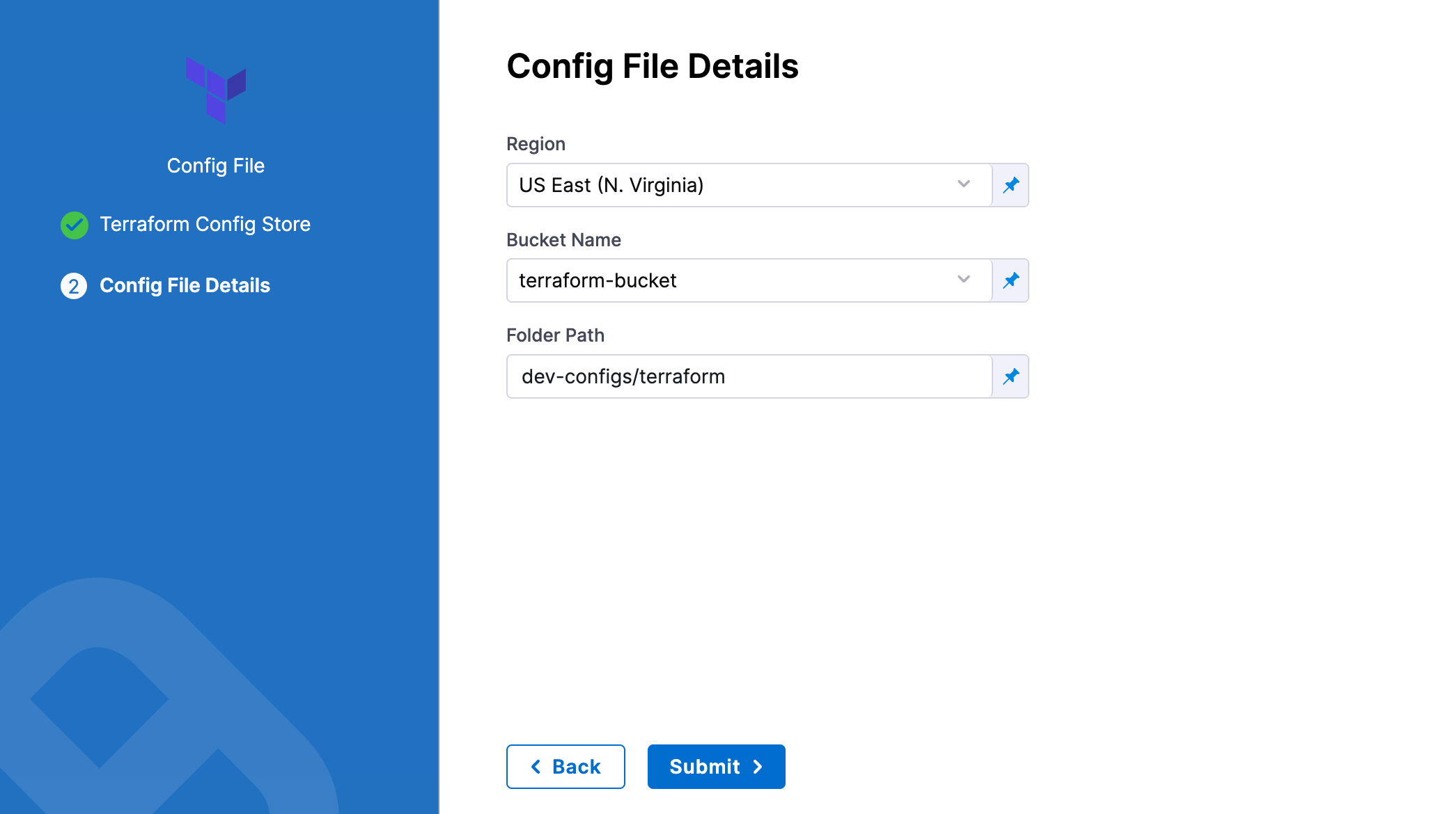 In Backend Configuration, you provide the required configuration variables for the backend type.
