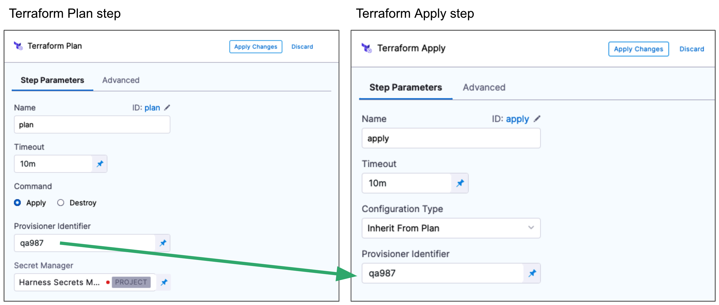 If you select Inherit from Plan, you'll enter the unique Id used by a Terraform Plan step in Provisioner Identifier.