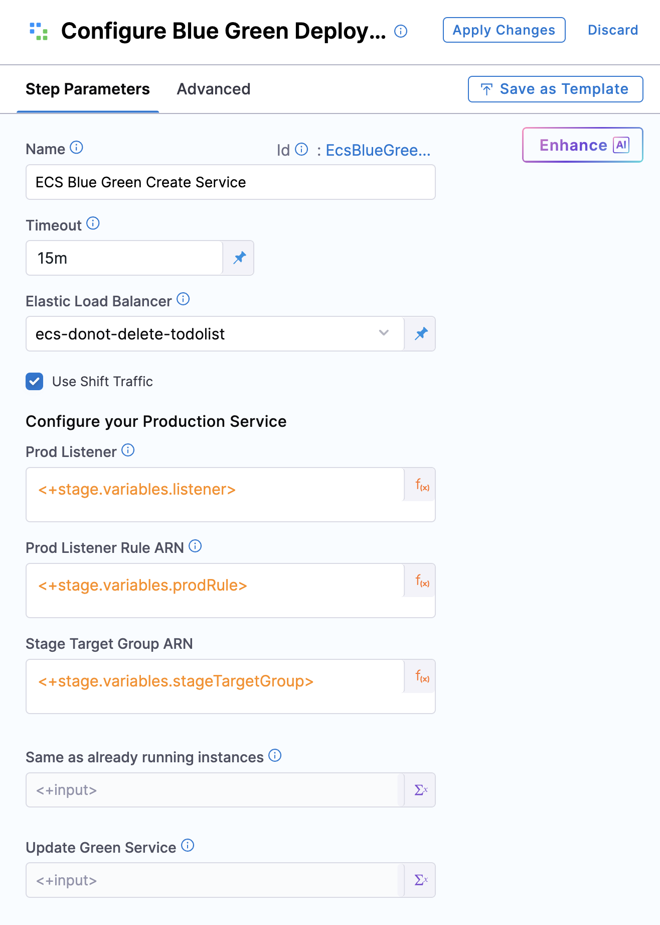 1. Add the ECS Blue-Green Create Service step with isTrafficShift: true. Optionally leave stageTargetGroupArn empty for automatic discovery (recommended), or provide a specific target group ARN for manual control.