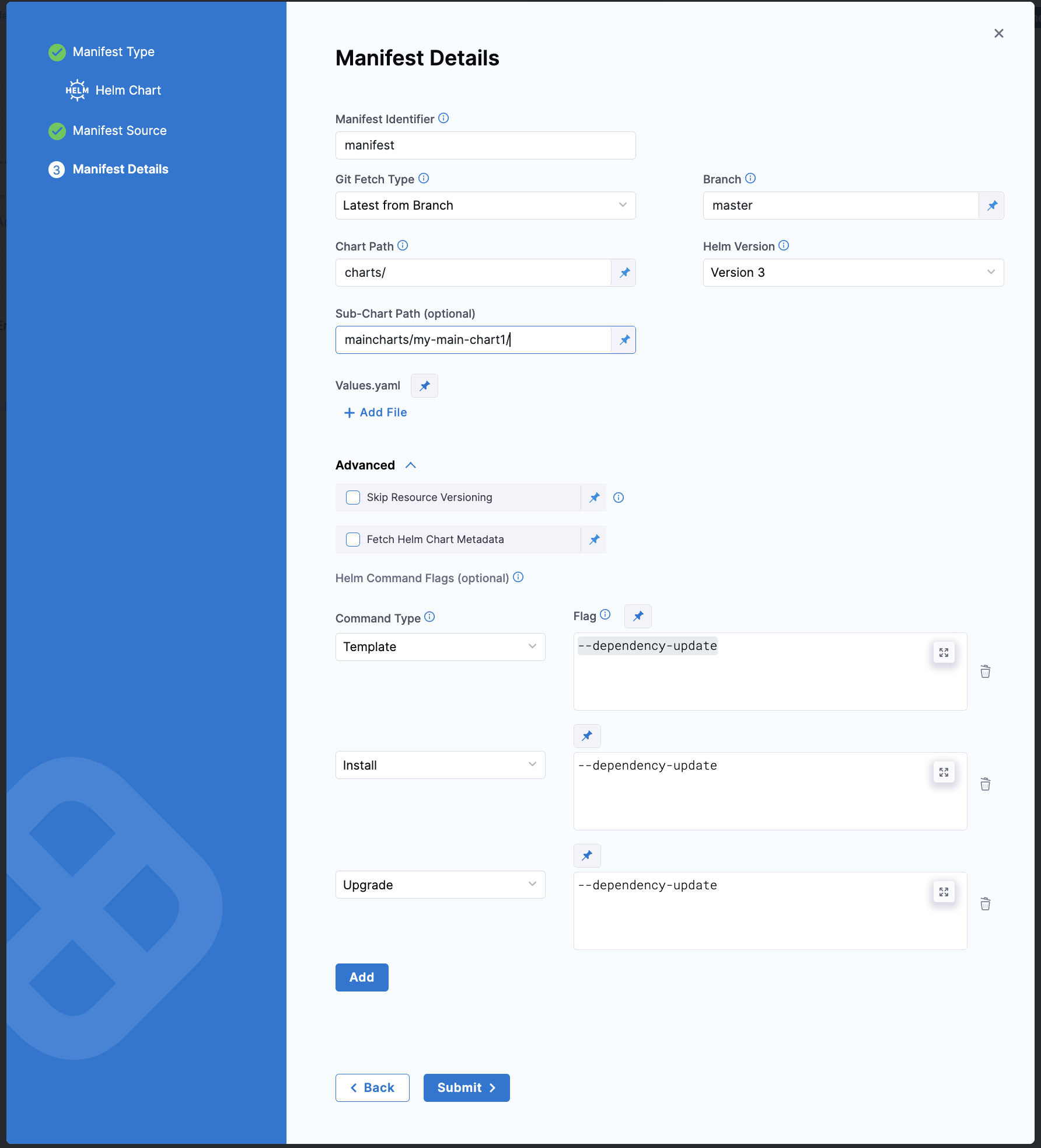 For Kubernetes with Helm deployments (as described in this topic), configure Helm Command Flags with the Template command type and