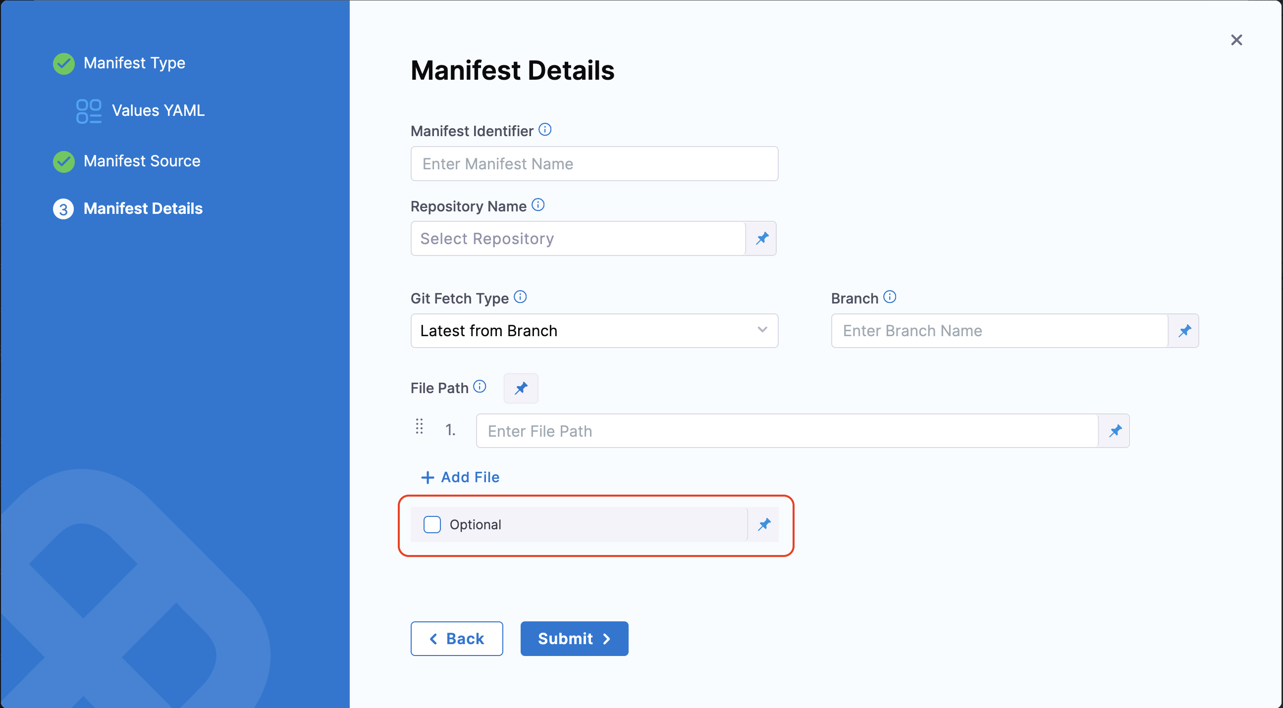 After you select the Cloud Provider option, you can configure the manifest details for fetching the chart from ECR: