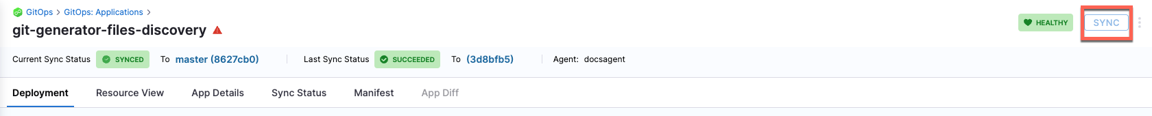 - Click the Sync button in the top right corner of the Applications page.