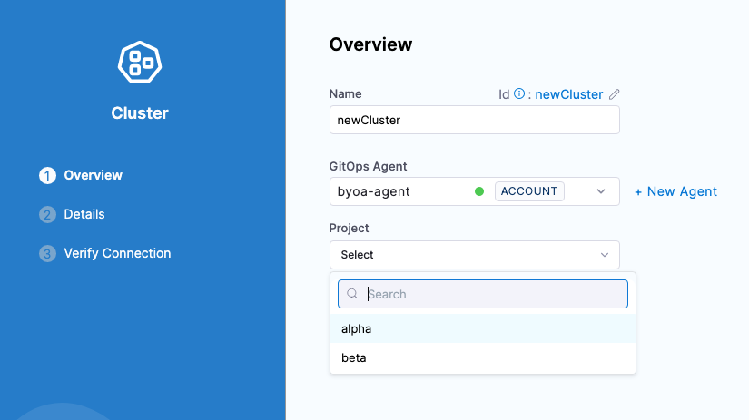 The following steps are common to all three entities (clusters, repositories, and applications) when you create them in Harness. We will demonstrate this with GitOps clusters: