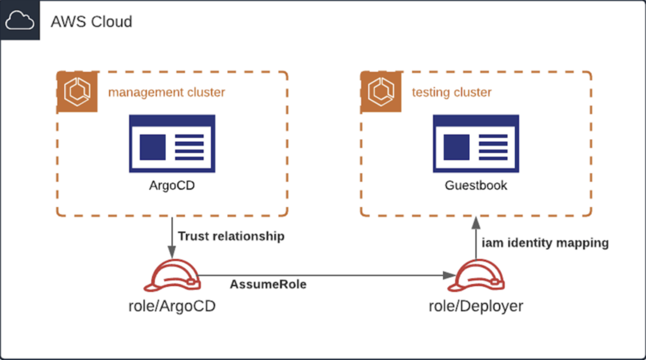 You could also use the Argo CD role directly. However, having a separate role to deploy resources into the testing cluster is recommended as it is more flexible and secure.