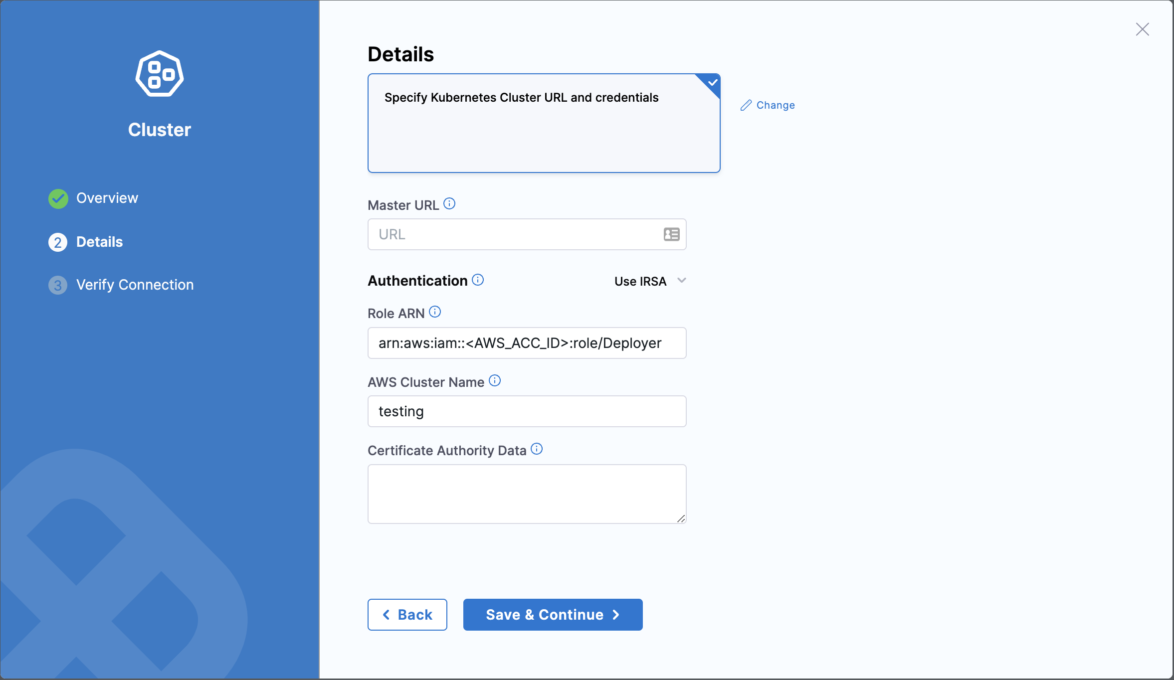 • Certificate Authority Data: Enter the corresponding public certificate of the Kubernetes API.