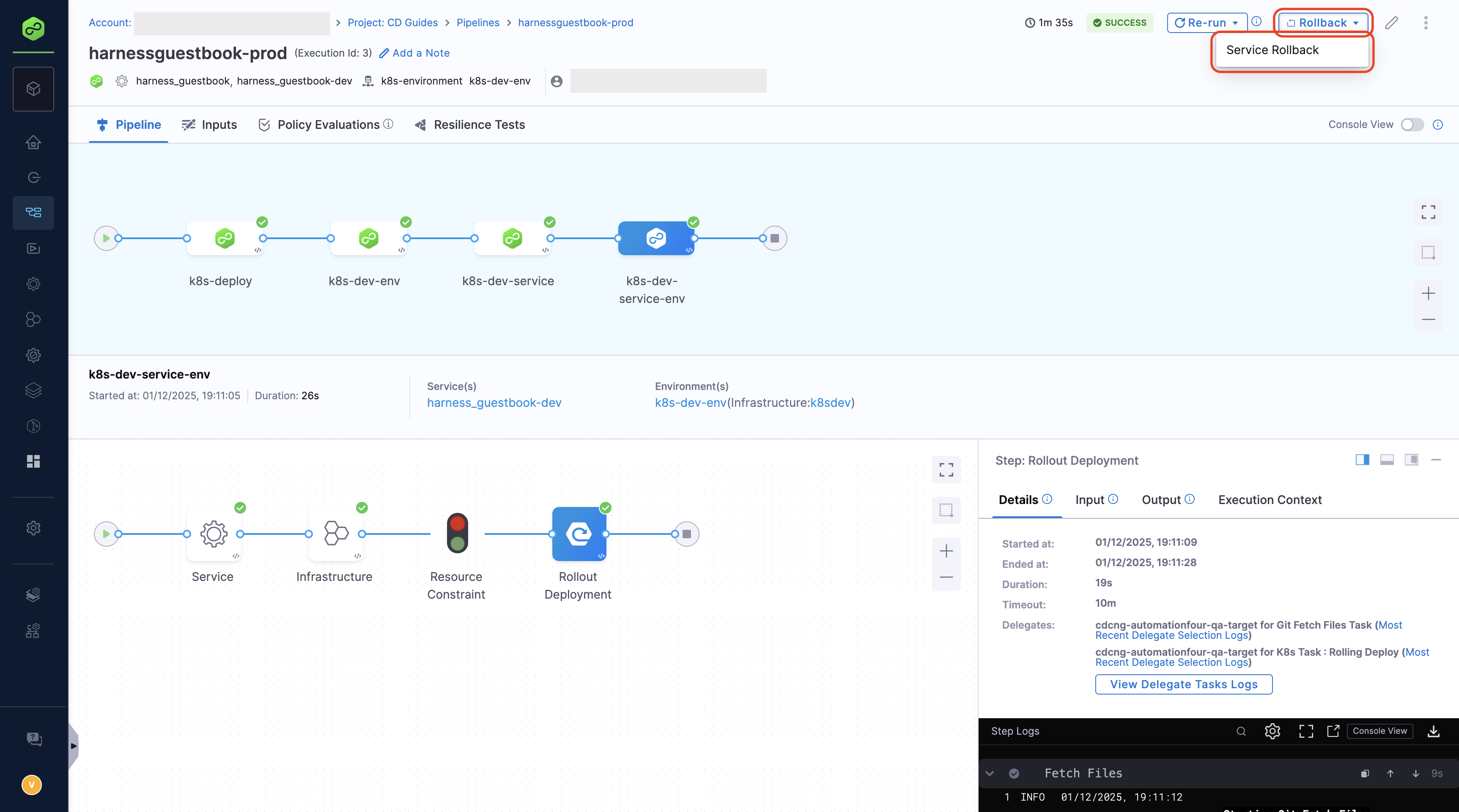 You will be directed to the pipeline execution page, and the Rollback Rollout Step will be executed.