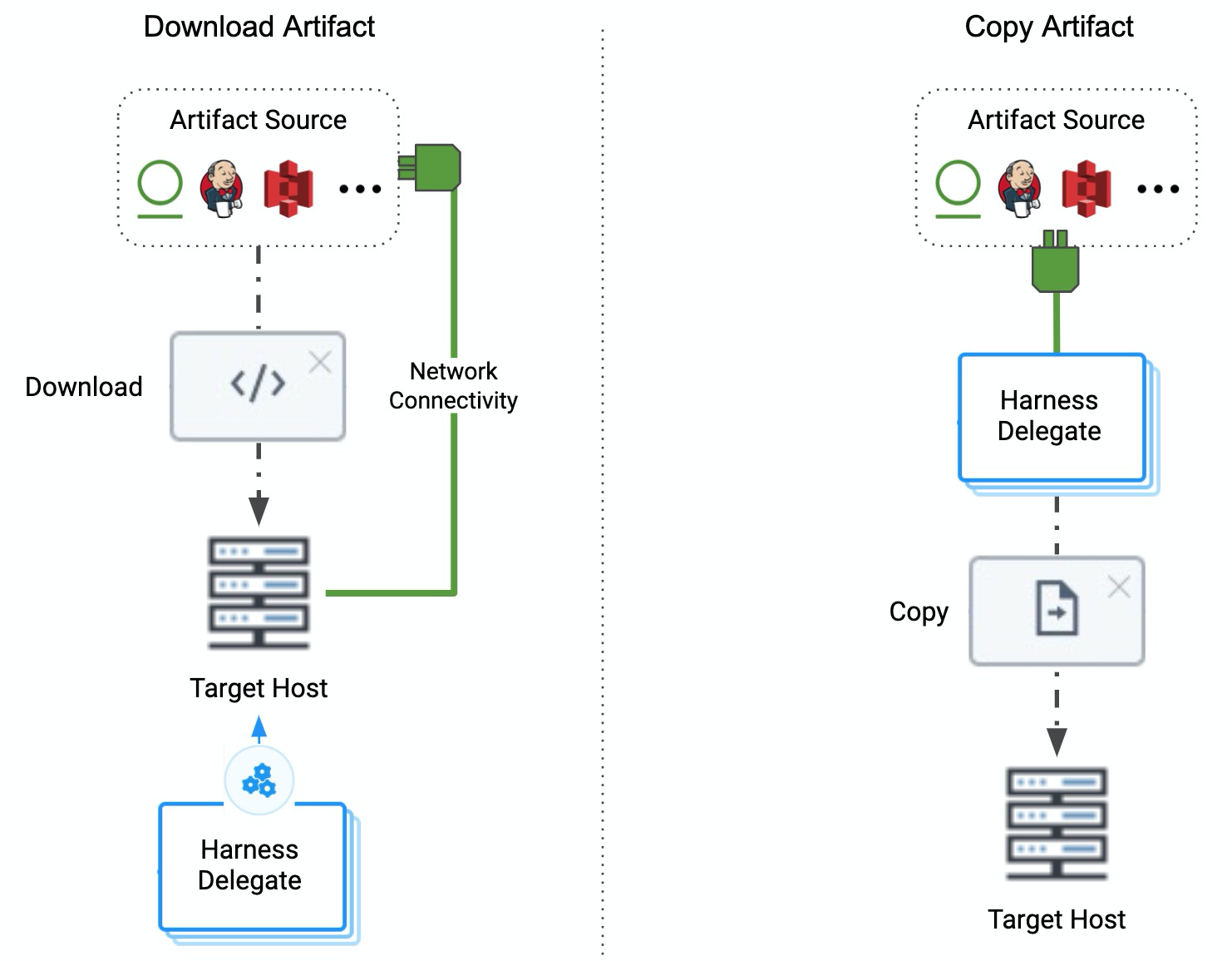 • Copy: During deployment runtime, Harness uses the metadata to download the artifact to the Harness Delegate. The delegate then copies the artifact to the target host(s).