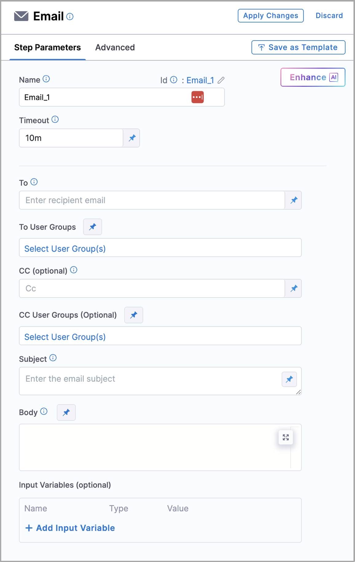 • Use input variables in the email step to customize the subject, body, and recipient list dynamically based on pipeline variables and context.