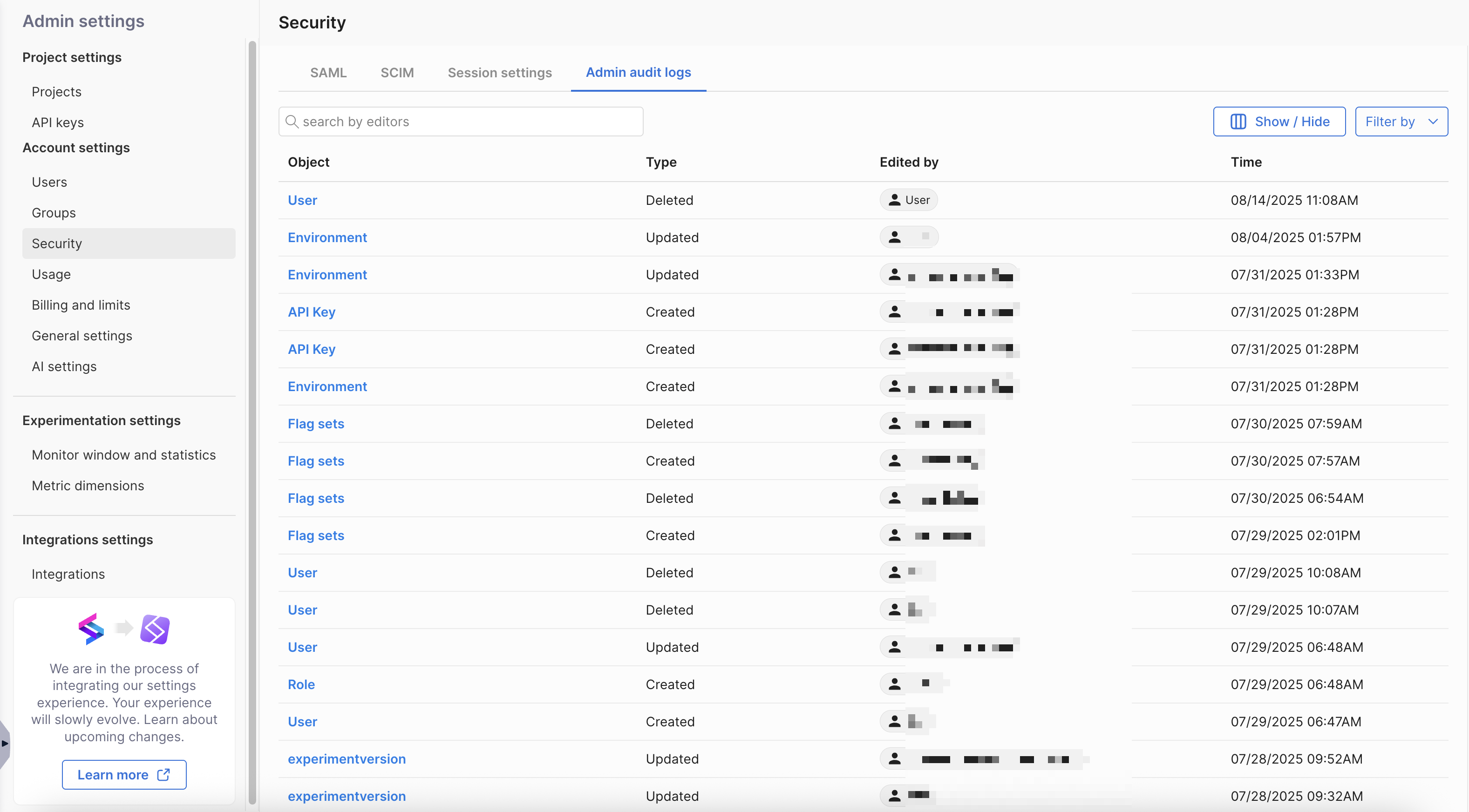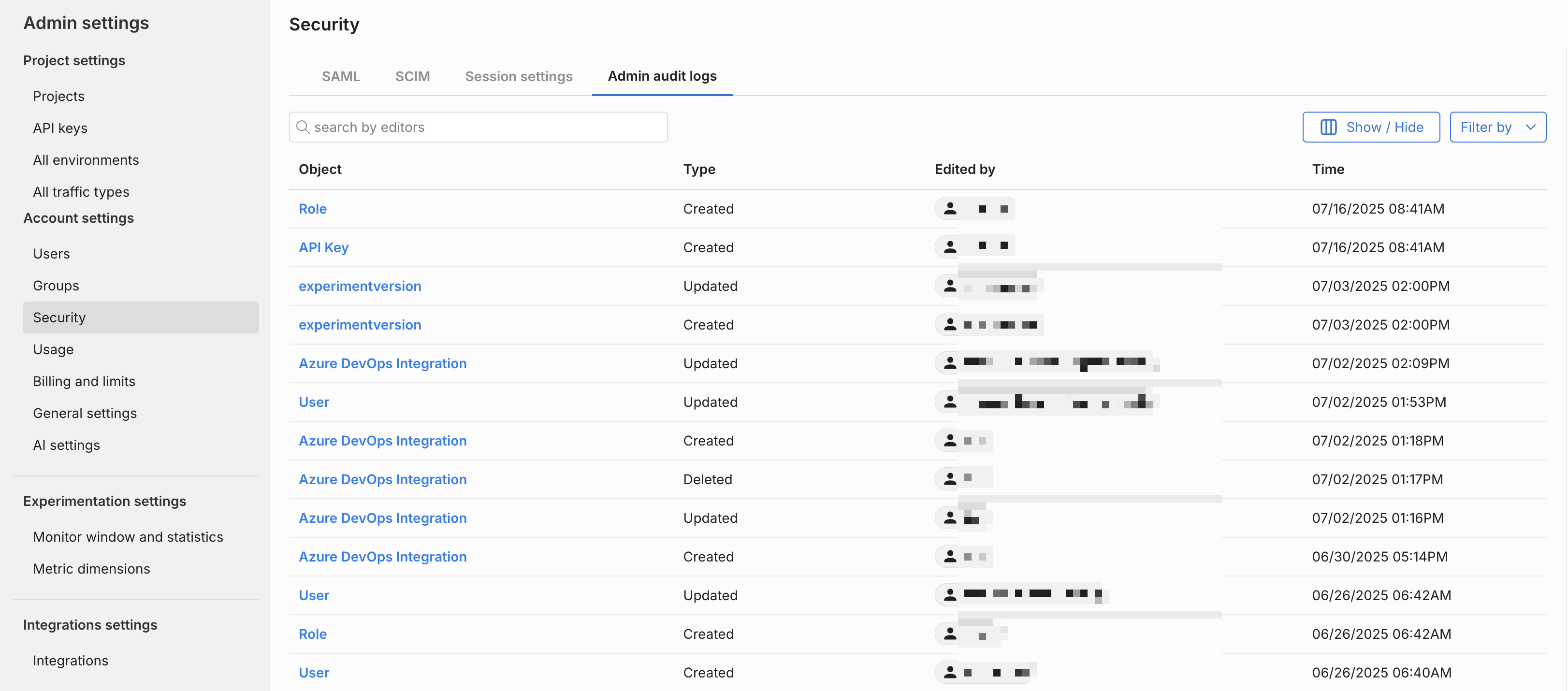 Access audit logs by navigating to FME Settings, select Security, and click the Admin audit logs tab. You can see a table of all changes that are made by users against the objects listed above.