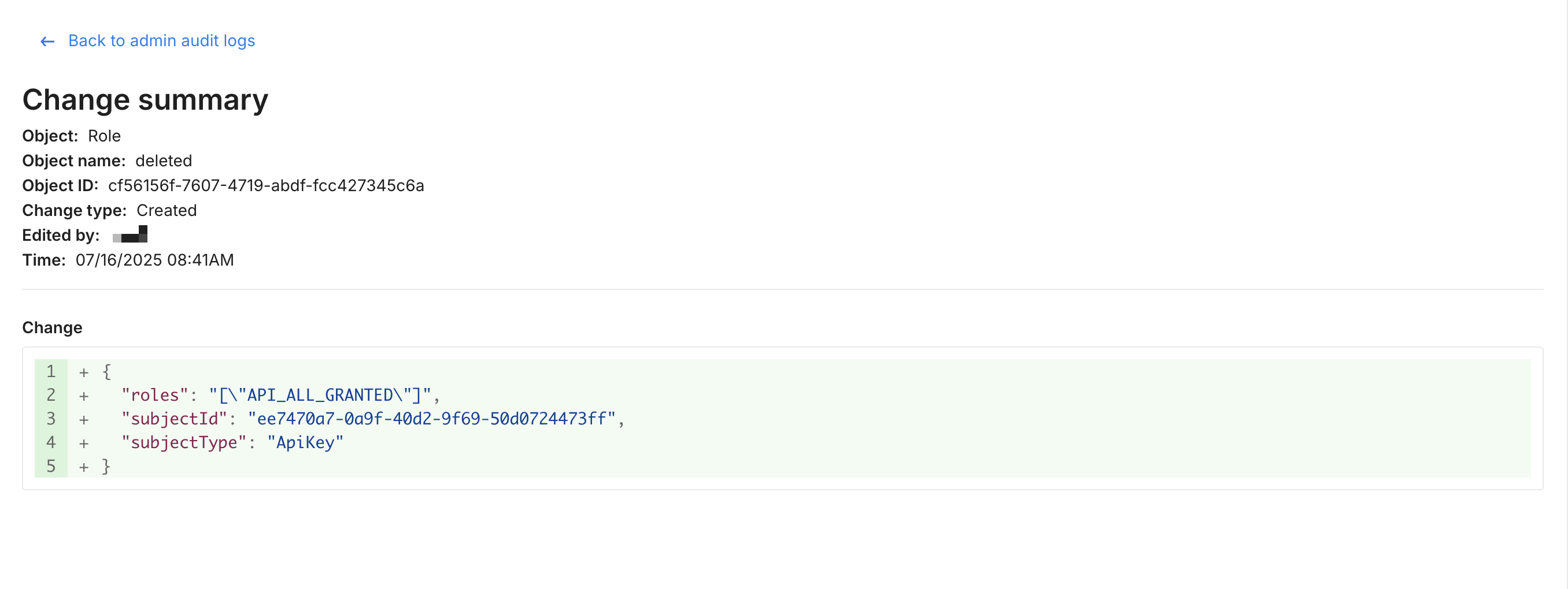 When hovering over the row for an audit log, click on the object name for that change to see more information about each update, including a diff view of what elements of the object were edited.