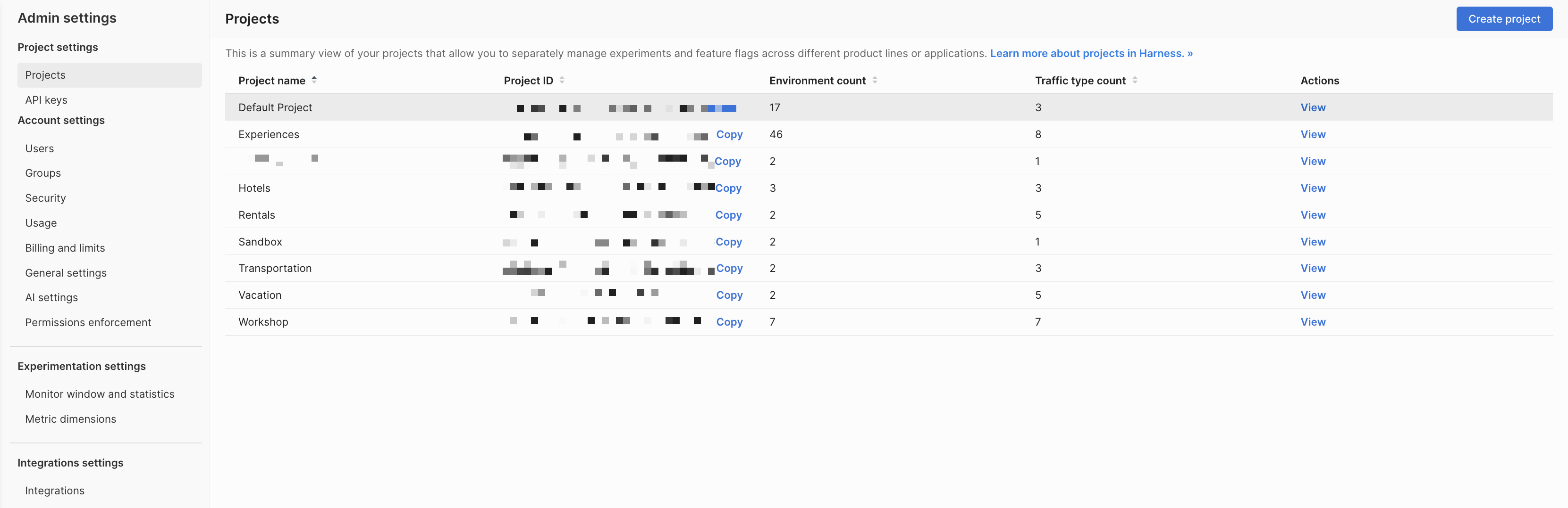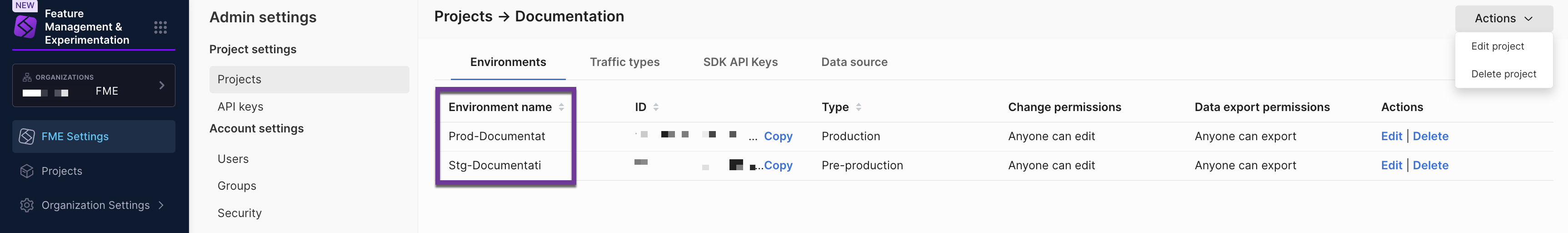 When you create an account in Harness FME, your default project provides you with two environments: Stg-<PROJECT_NAME> for pre-production and Prod-<PROJECT_NAME> for production.
