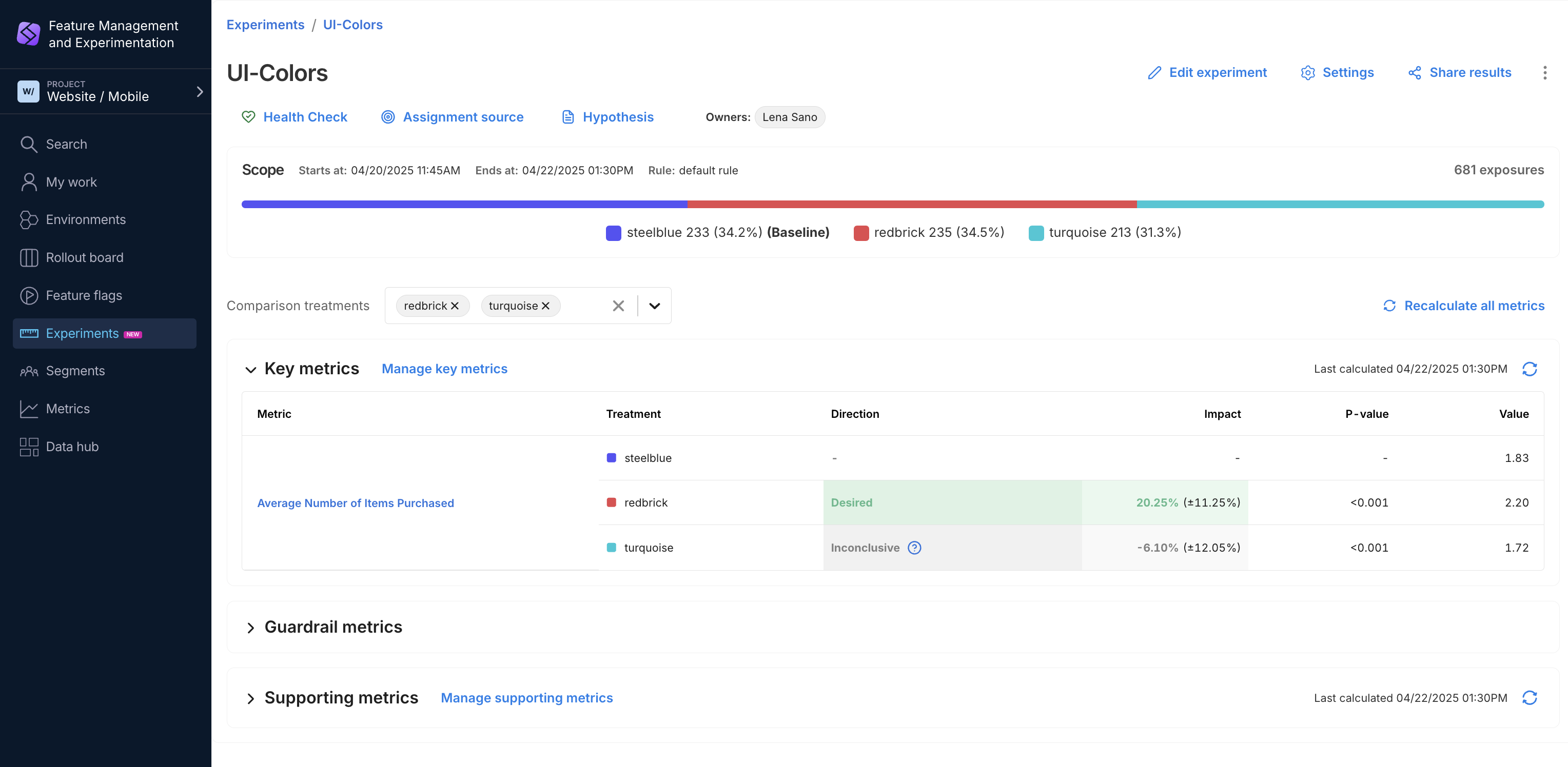 After launching an experiment, you can view the results directly in the Experiments Dashboard. The metric results table summarizes key information for each treatment, providing a clear understanding of how the experiment impacts your key, guardrail, and supporting metrics.