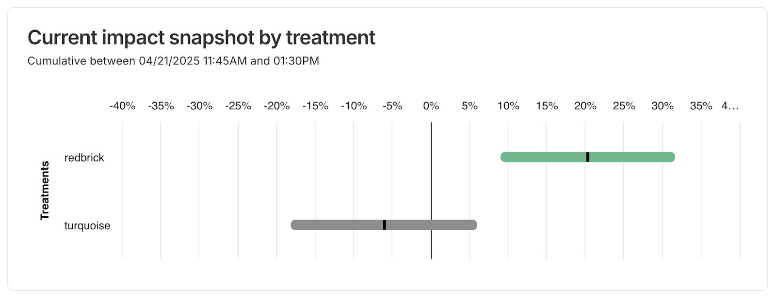 You can visualize the relative % impact of the treatments compared with the experiment's base treatment.