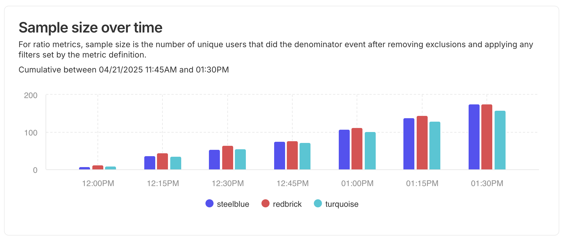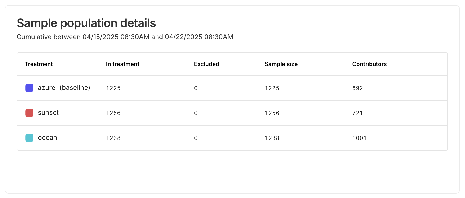 The Cumulative sample size over time chart makes it easy to compare treatment sample growth. You can quickly tell if both treatments are growing at a similar rate or diverging.