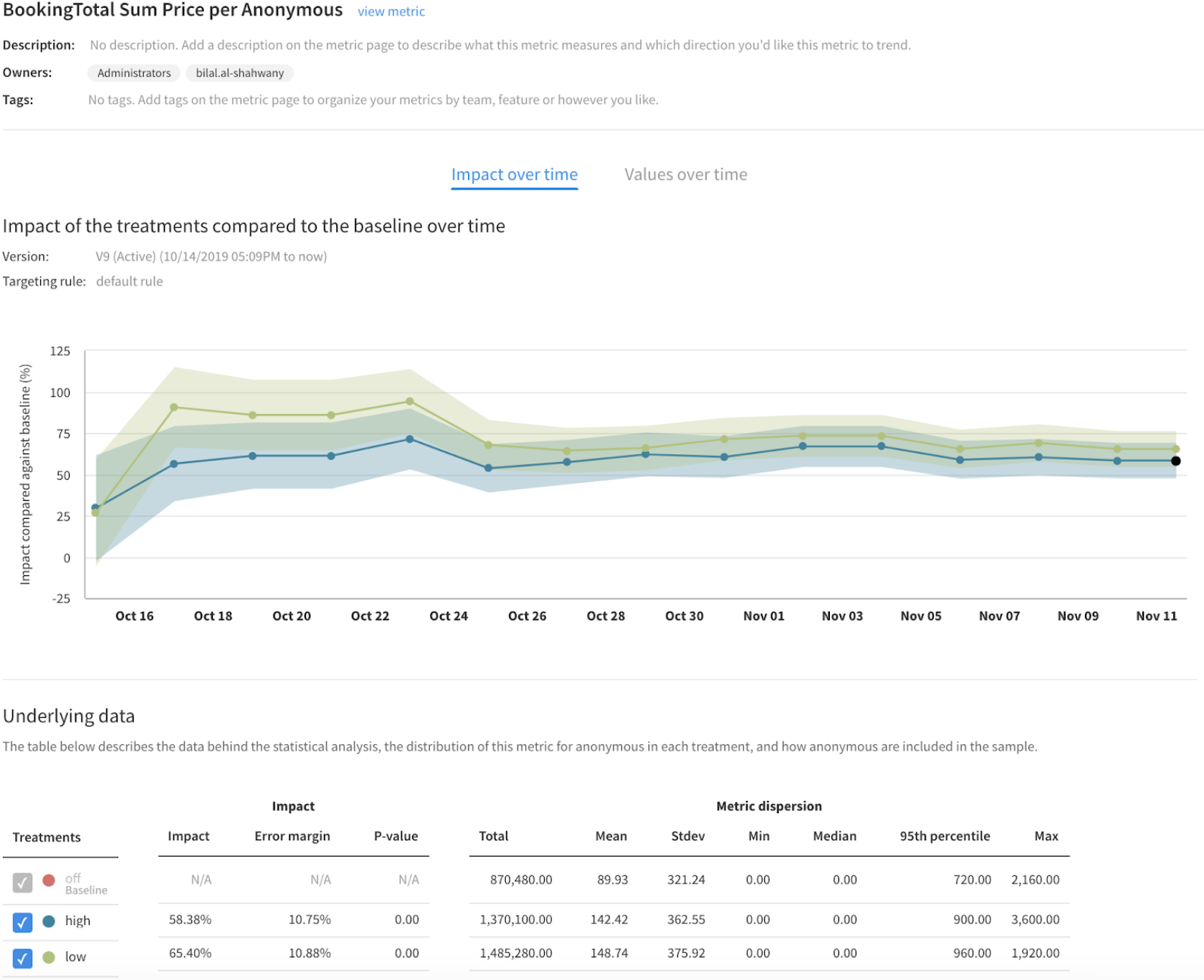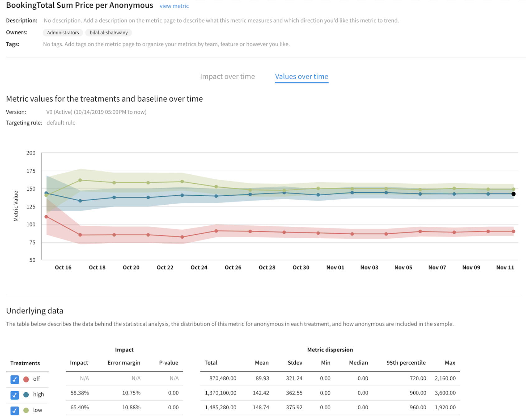 • Review the aggregated metric value for all treatments in the Values over time chart