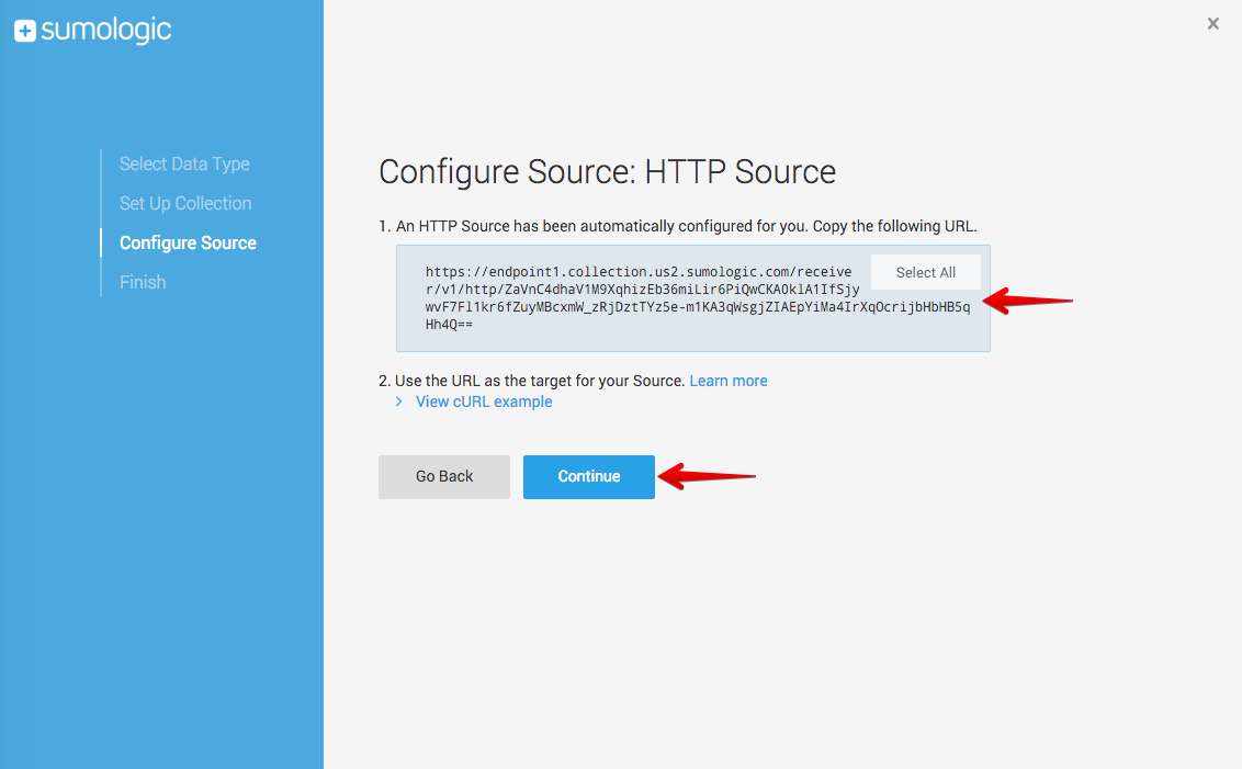 5. Copy the URL provided to configure the Sumo Logic integration in Harness FME , and then click Continue. This URL contains the token/key used to identify your Sumo Logic account.