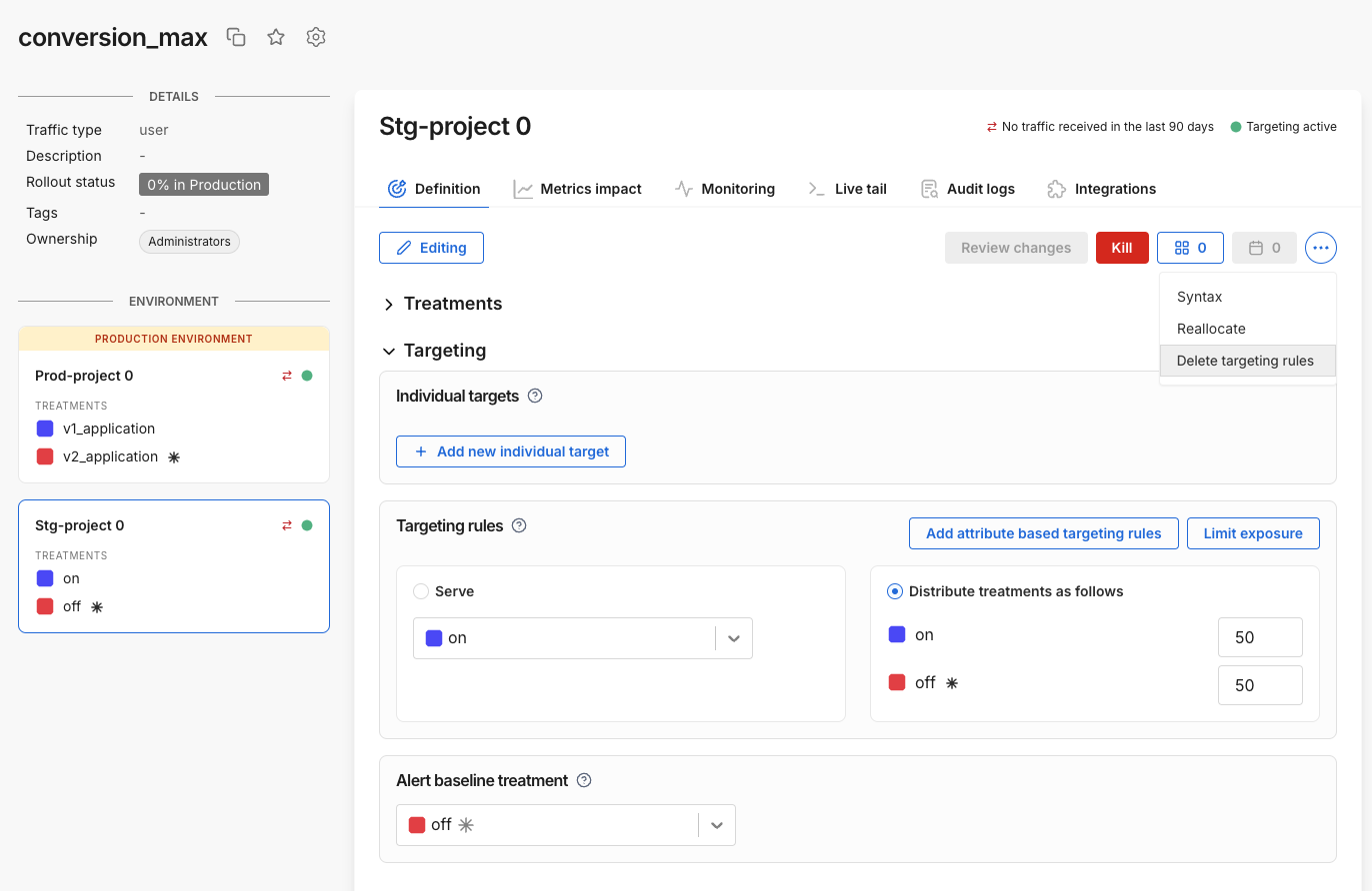 Projects allow you to separately manage your feature flags and experiments across your different business units, product lines, and applications. When you first create your account, you're provided with one project named Default.