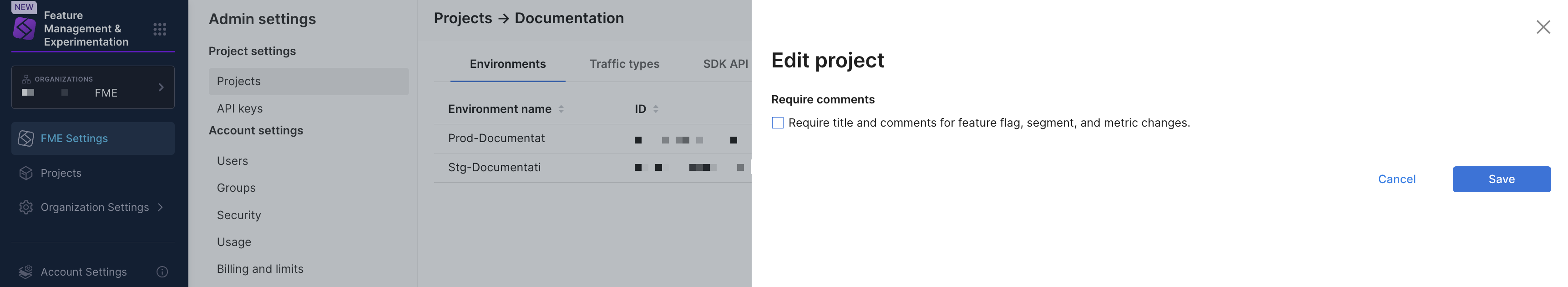 In the Edit project pane, enable the Require comments toggle to enforce titles and comments for changes to feature flags, segments, and metrics.