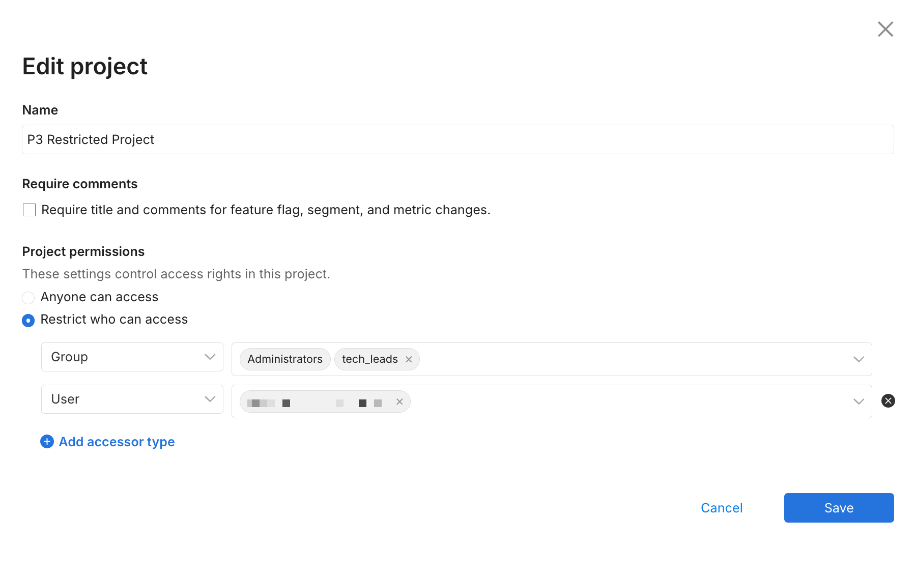 - Restrict who can access. Allows you to select which users, groups, and admin API keys have access to a particular project.