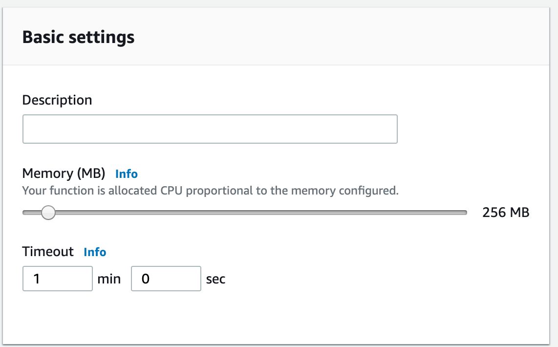 - Under Basic settings, set Memory (e.g., 256 MB)