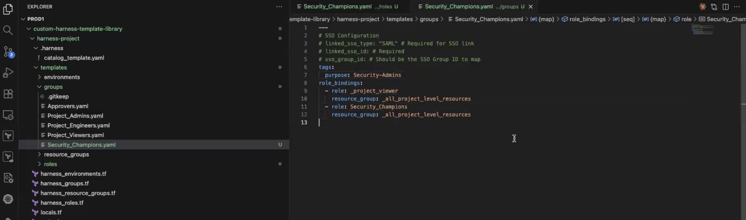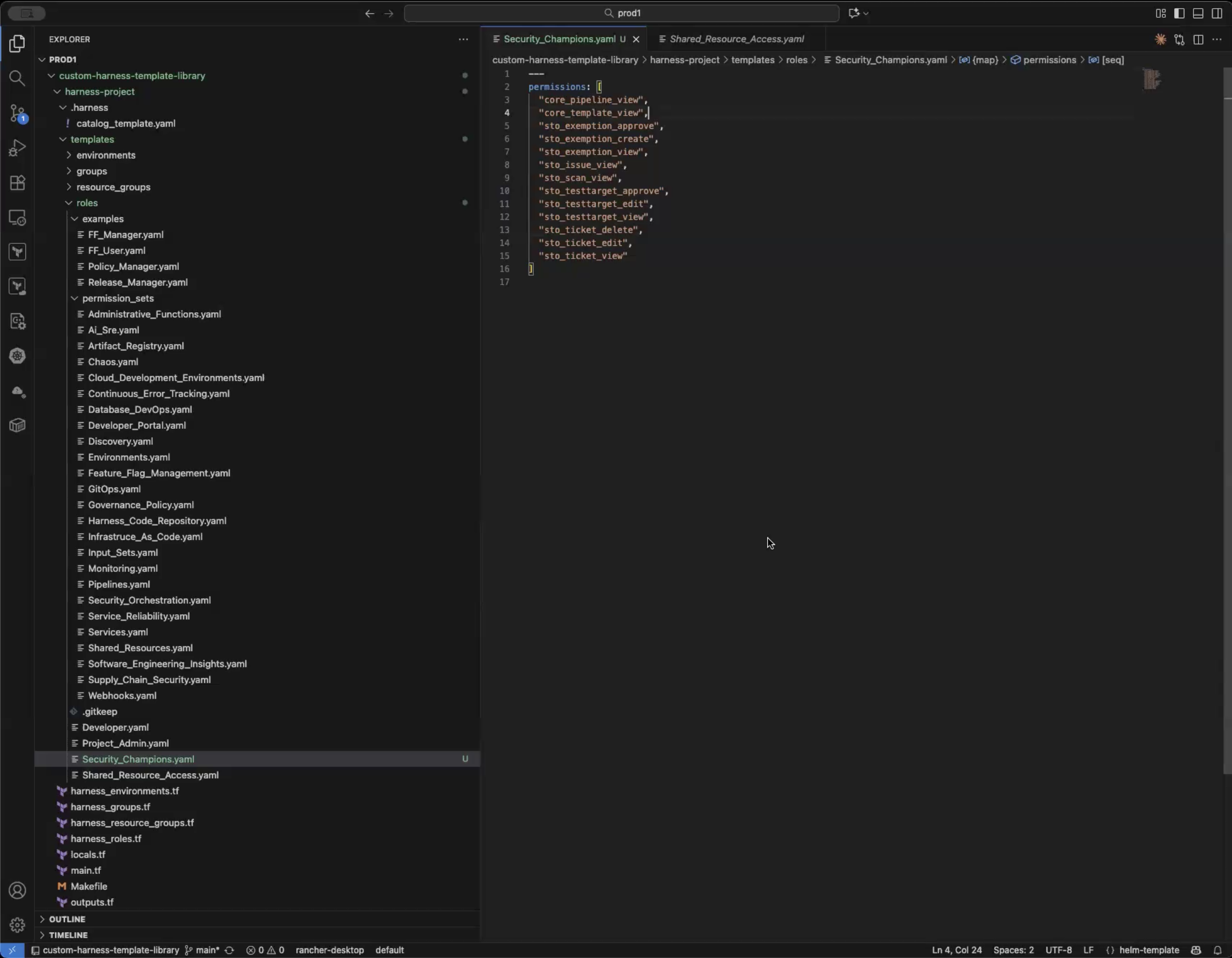 custom-harness-template-libraryand create a new file calledSecurity_Champions.yamlunderharness-project/templates/rolesthat includes what privileges this group should have. Sample permission sets are included under thepermission_setsdirectory. It should look something like this: