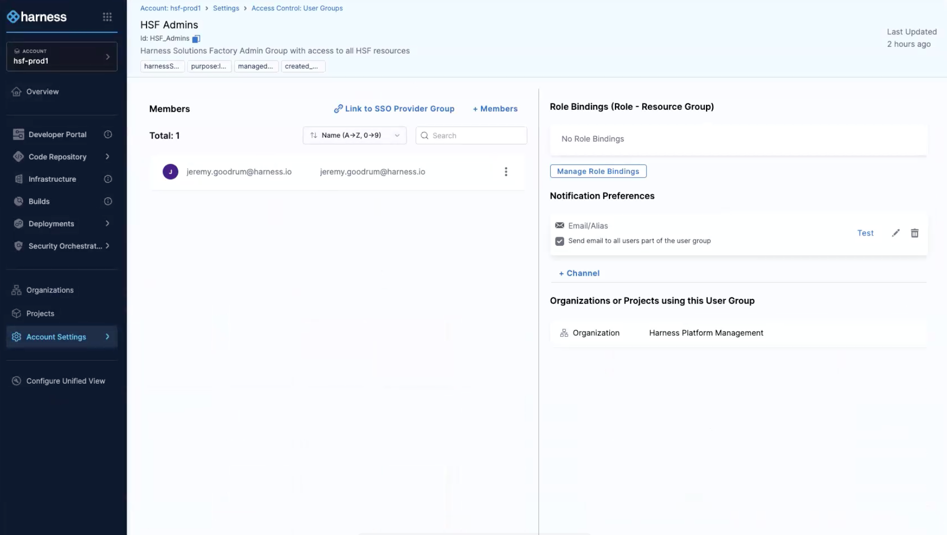 harness-project/templates/groupsthat tags the new group. For our example our group will have project viewer and all the privileges that we included in the role. It will look like this:
