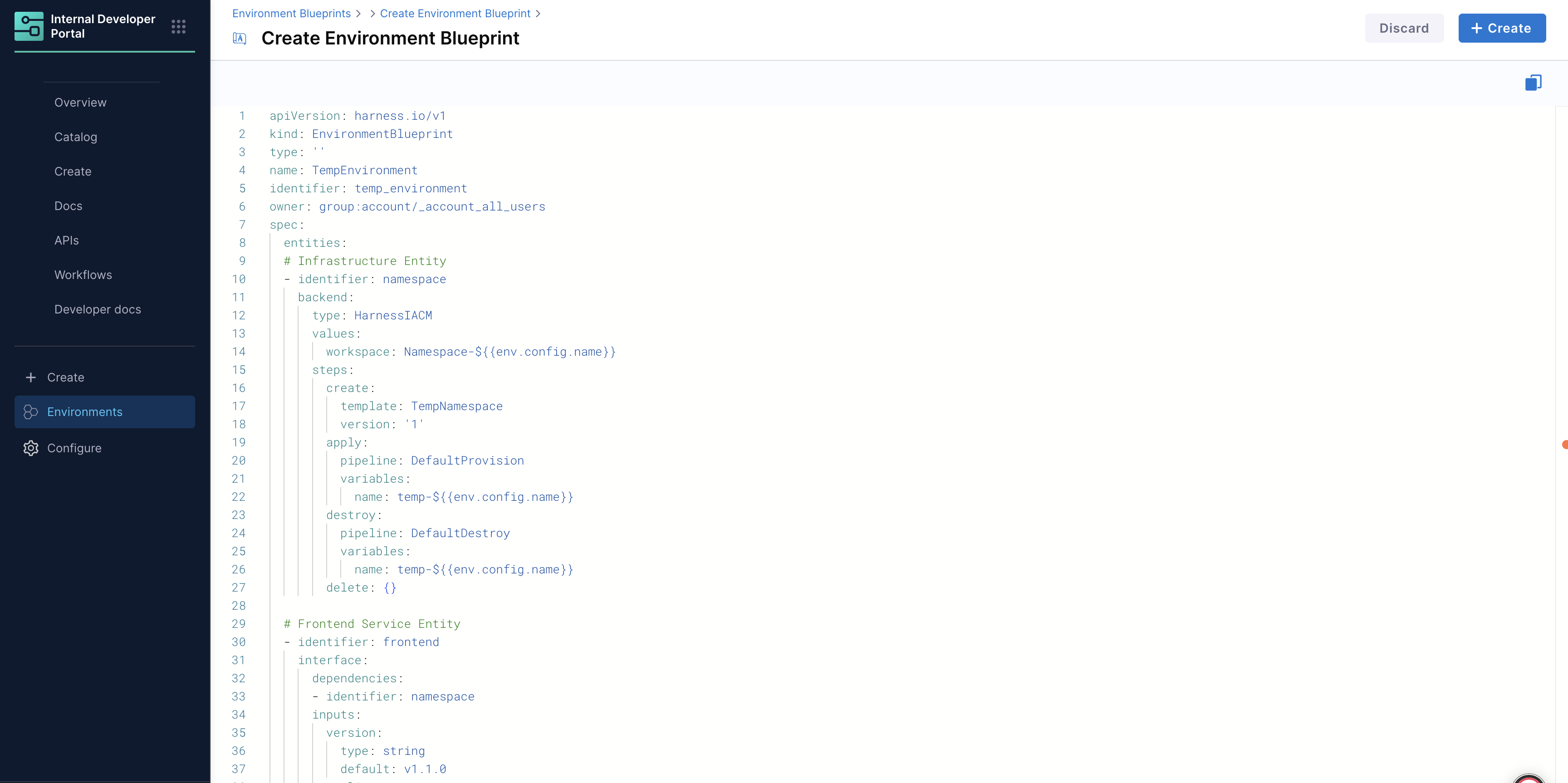 An Environment Blueprint is defined using a declarative YAML format. The YAML structure defines infrastructure templates, services, dependencies, and lifecycle management for environments.