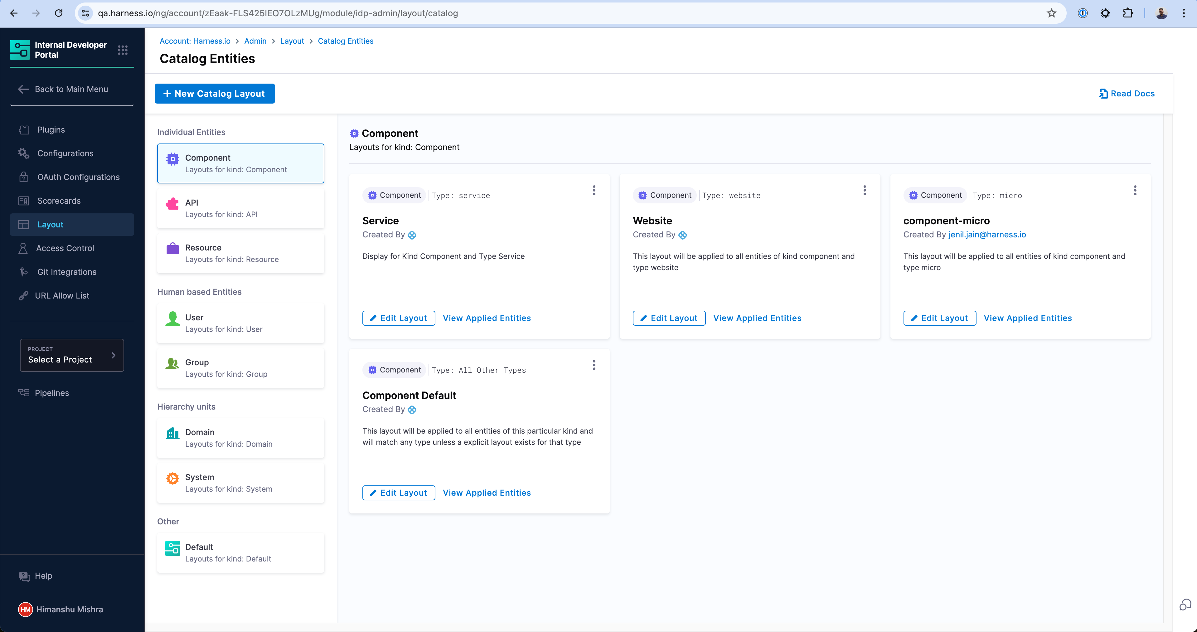 - Go to the Layout Page and under Admin and select Catalog Entities.