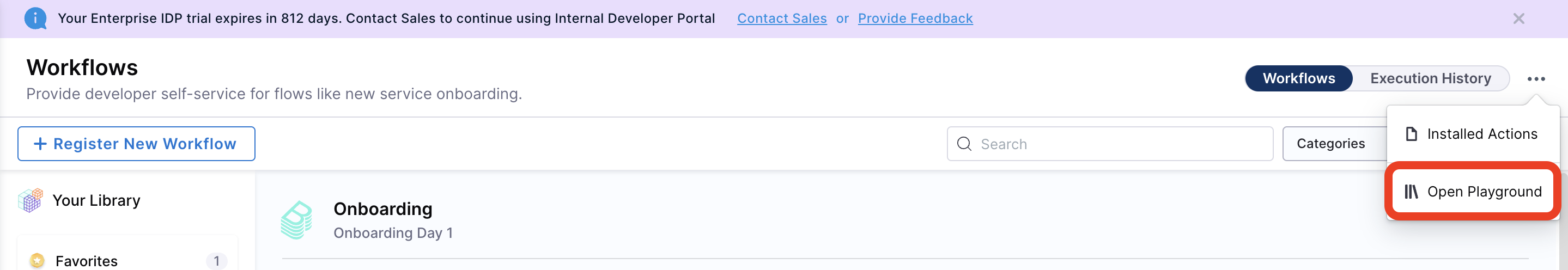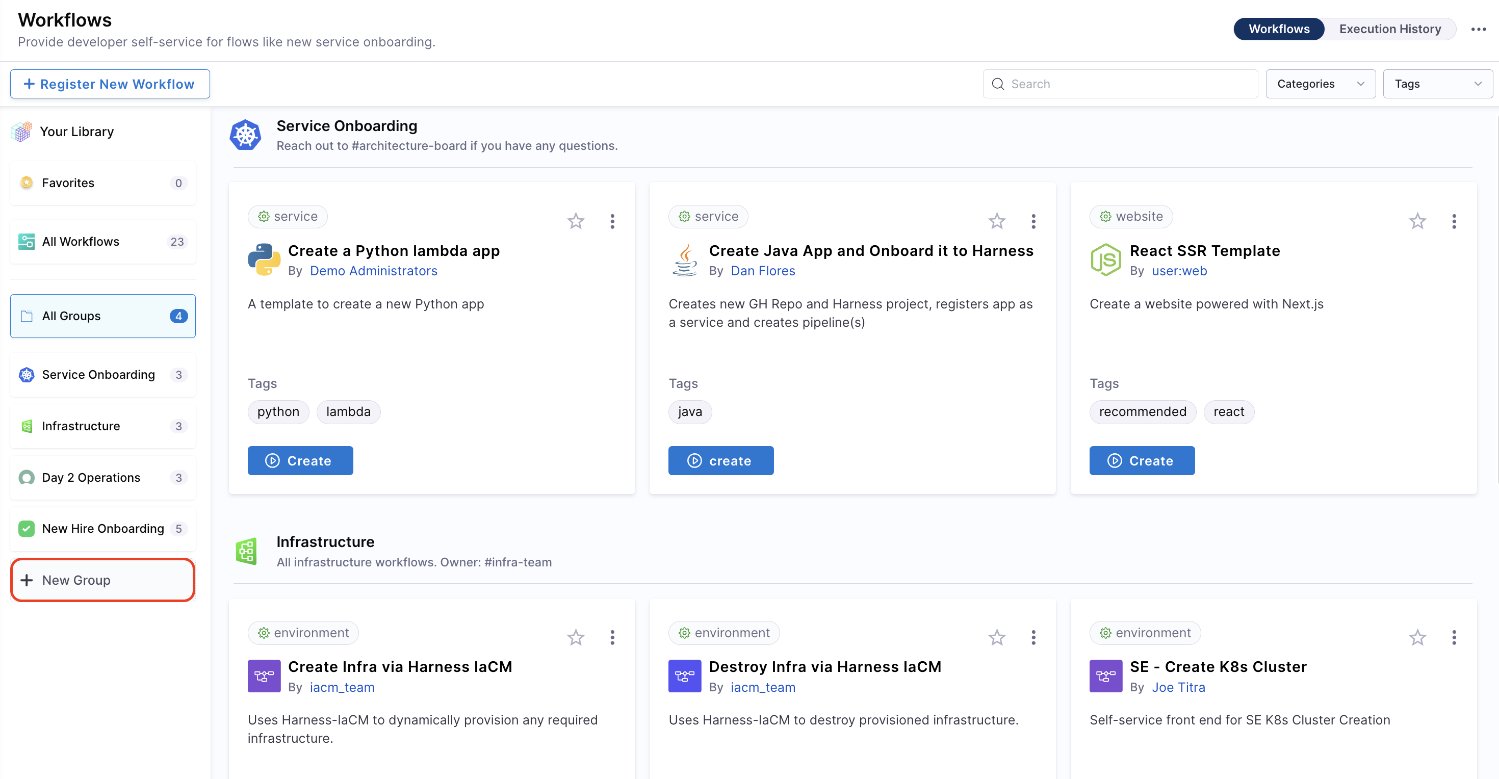 You can organize your IDP Workflows into groups such as Service Onboarding, Infrastructure Use Cases or Day 1 Onboarding using the Workflows Homepage Customization. You can also change the icons of individual groups and each Workflow. You can also change the primary button text from "Execute" to more suitable verbs such as "Create", "Delete" or "Run" with appropriate intent colors. Finally, you can change the order of the groups and Workflows within an individual group as well.