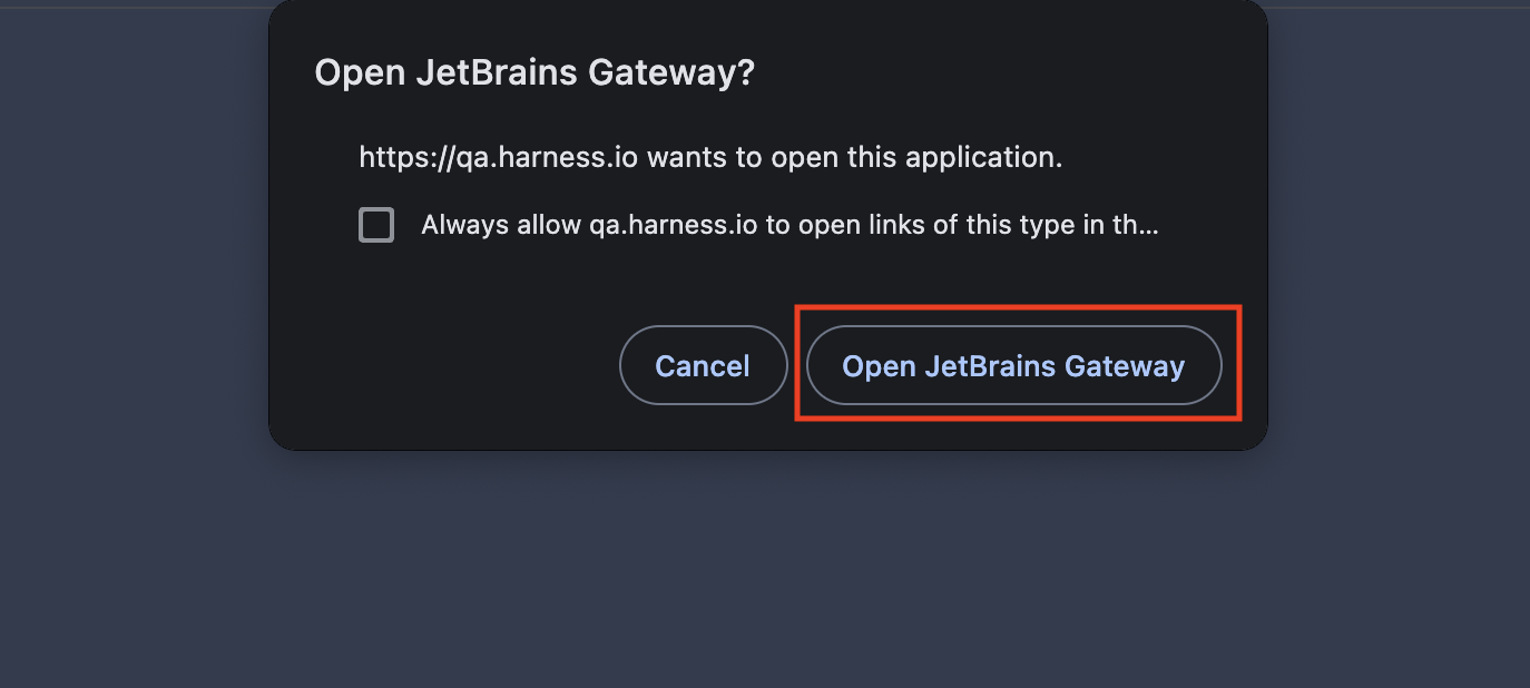 1. A prompt will appear requesting permission to open JetBrains Gateway and establish a connection with the remote server. Click "Open JetBrains Gateway".