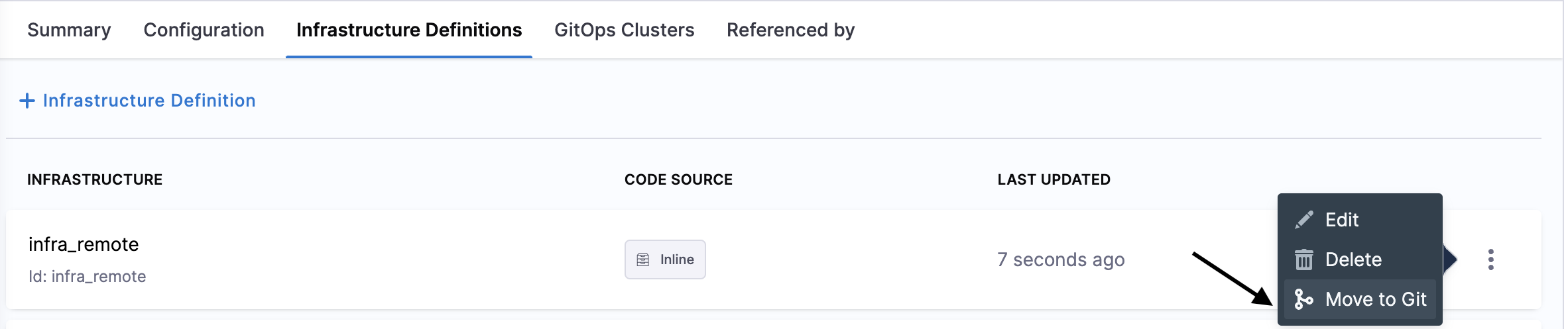 1. Select an environment, and then select the infrastructure definition you want to store in your Git repo.