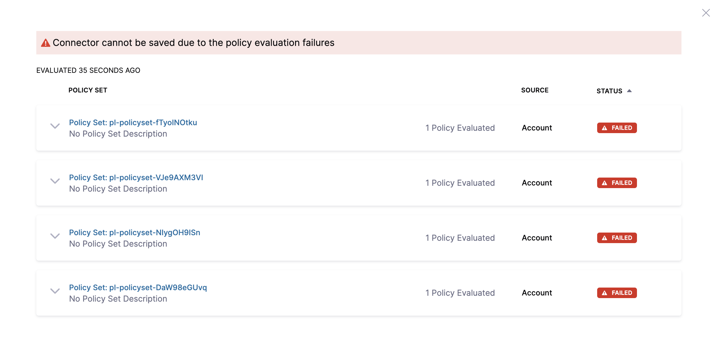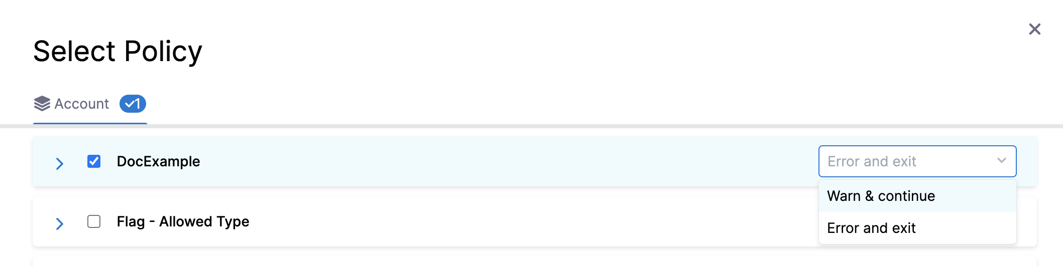 • Error and exit - You'll get an error and be exited without saving the Connector if the policy isn't met when the Connector is examined.