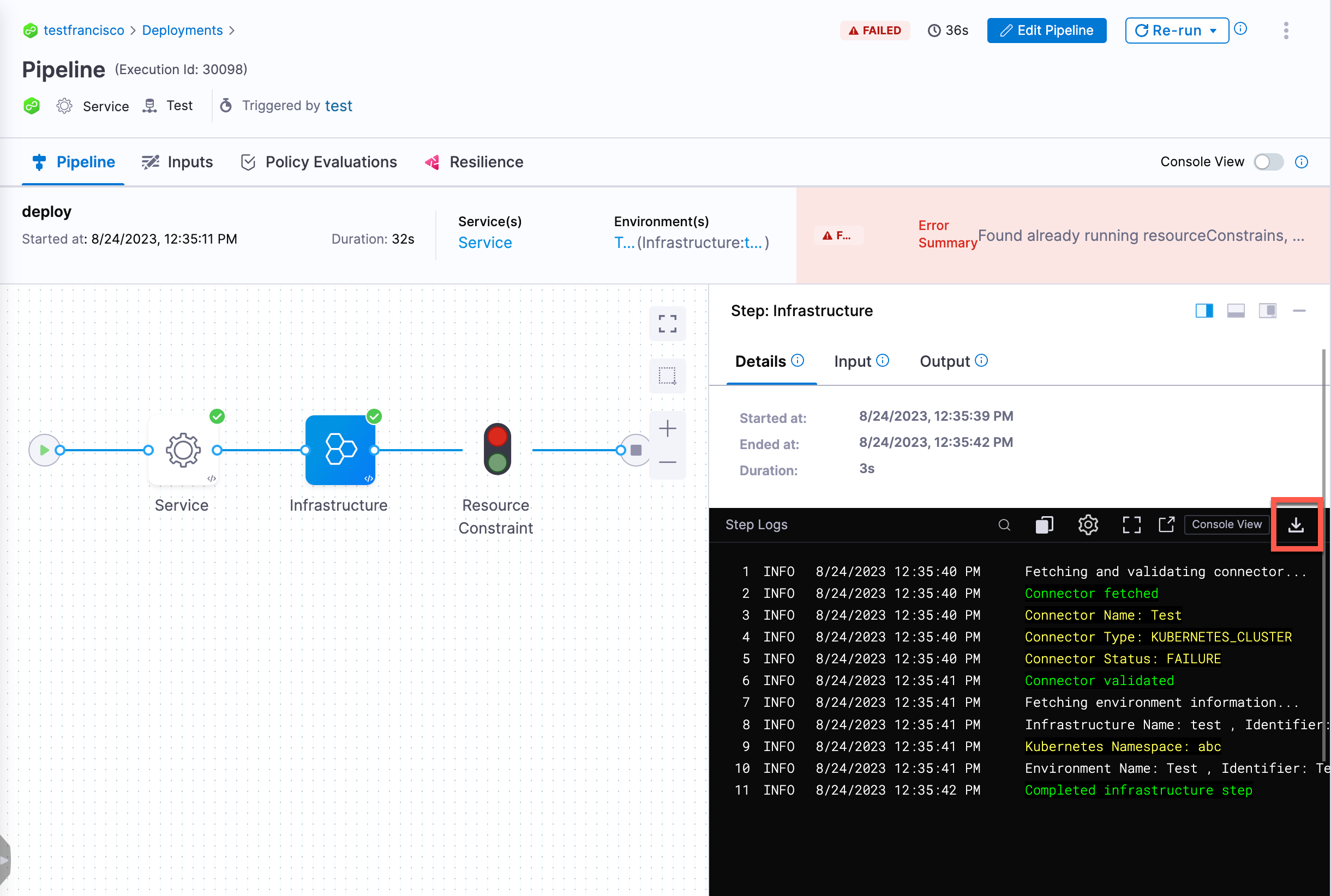 The process of downloading logs is the same for all Harness modules. Your access to certain modules and settings limits the functionality available to you.