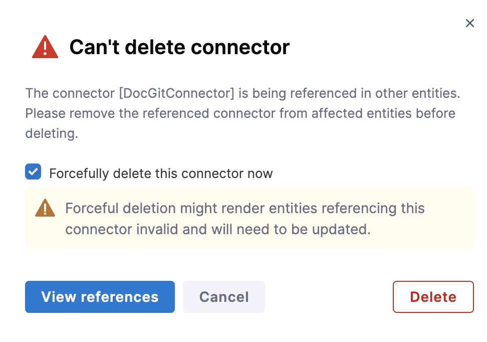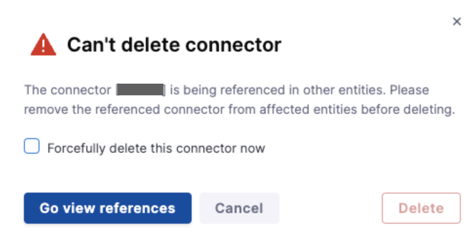 2. Connector is referenced in Harness entities - If your connector is referenced in a Pipeline or any other Harness entity, you can view the corresponding references or force delete it by selecting Forcefully delete this connector now.