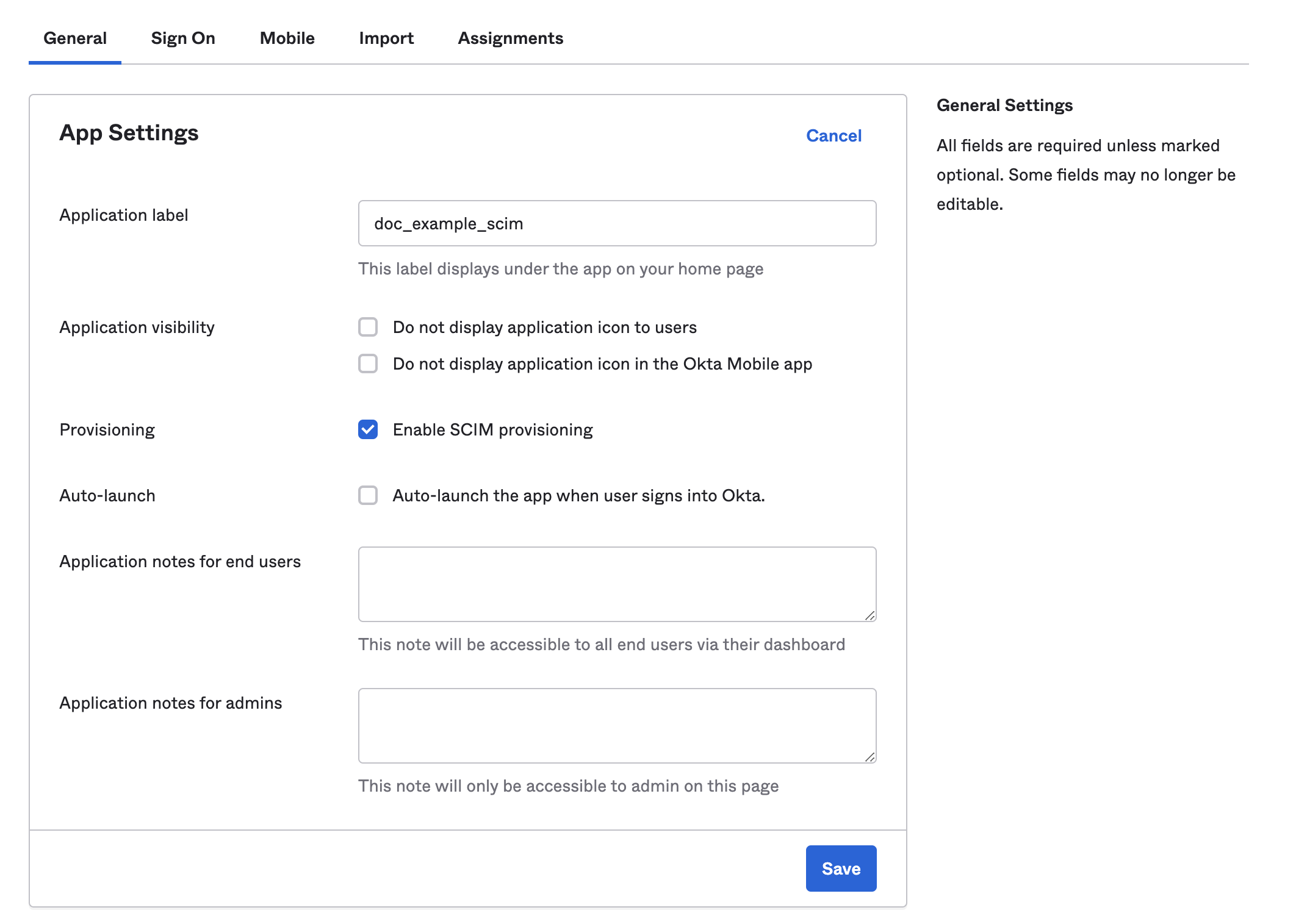3. In the General Settings, enter a name in the Application label field, and then select Next.