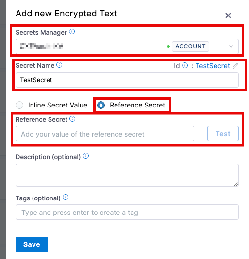 4. Fill in all additional details such as the Secrets Name, ID, Tags and Description.