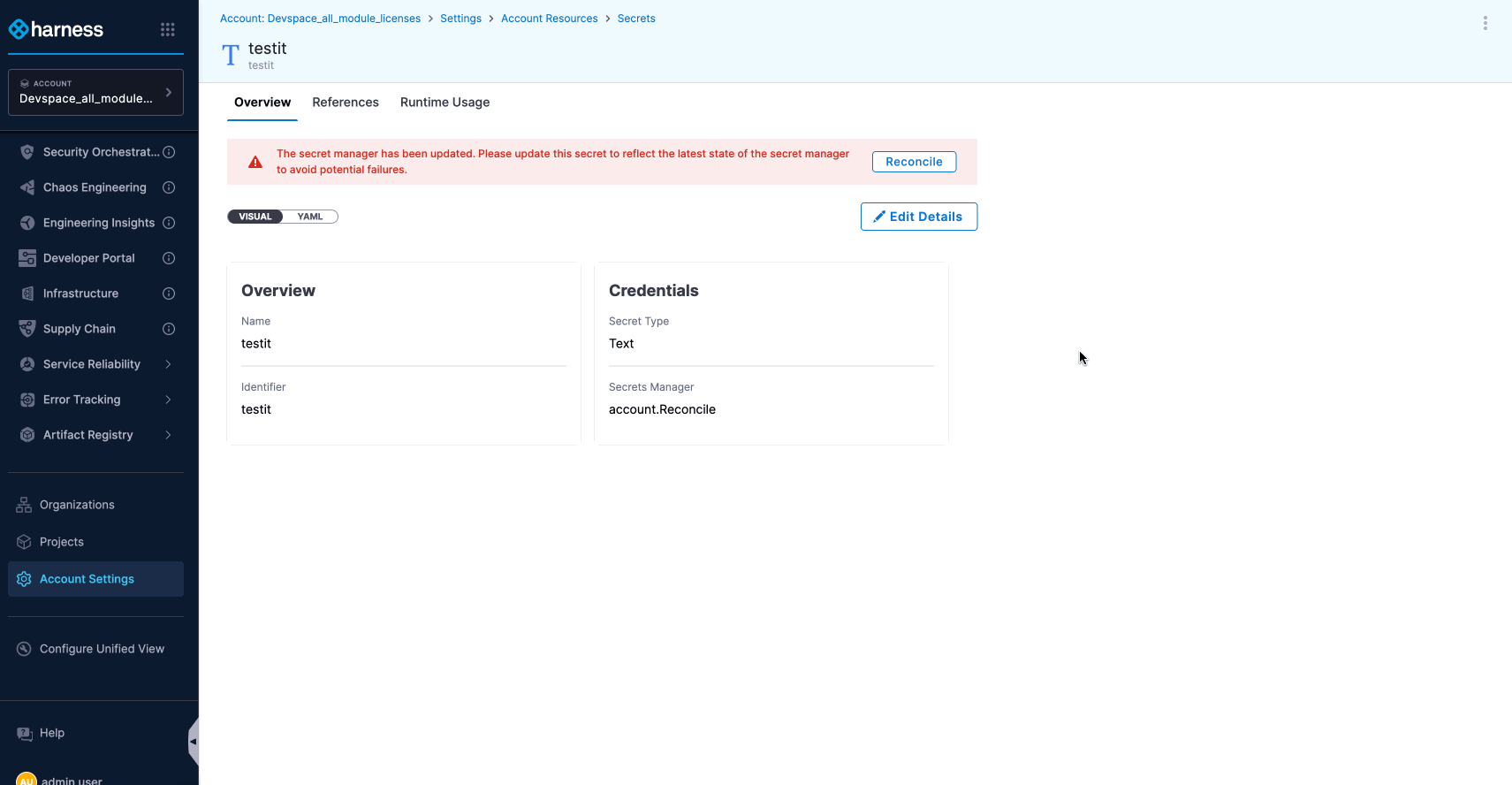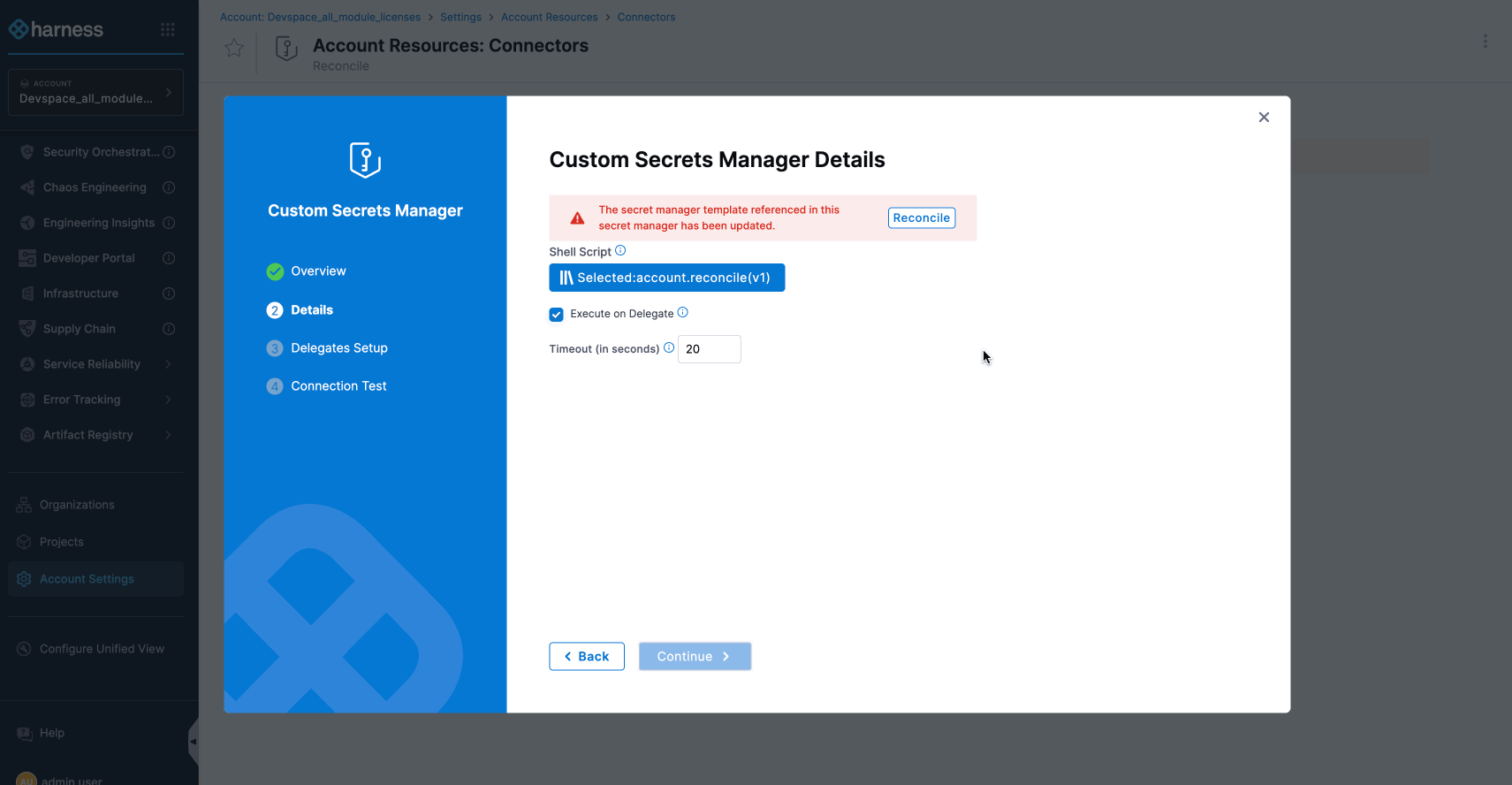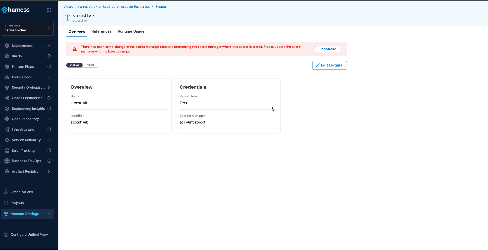 If a Secret is created in a Custom Secret Manager that needs reconciliation, Harness will redirect you to the Secret Manager page to complete the Custom Secret Manager reconciliation first.Click to view