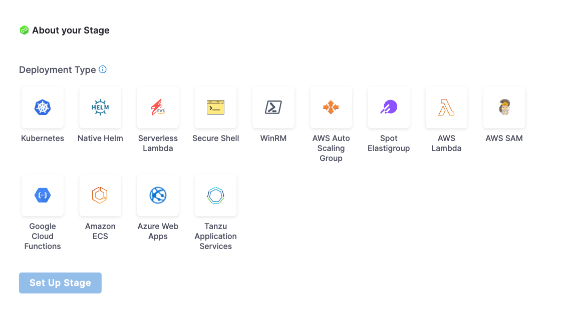 3. Select the type of deployment this stage must perform. For this example, select Kubernetes. The deployment type is how your service will be deployed. For example, using Kubernetes, Native Helm, Serverless, etc. Select the platform for your deployment. When you select a platform, its specific settings open.