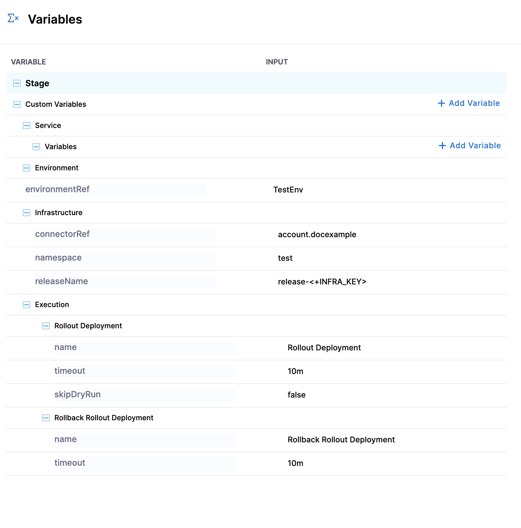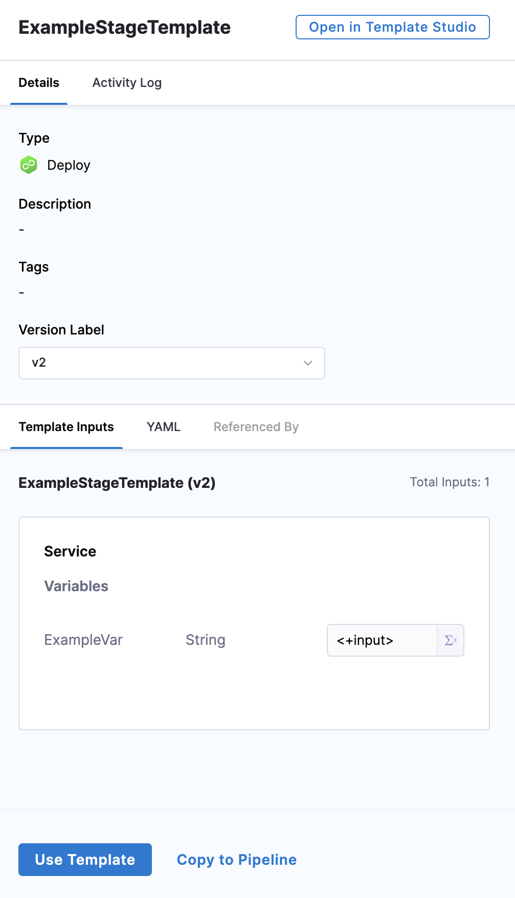 The stage template demonstrated in this topic uses runtime inputs. Runtime inputs are placeholders for values that you provide when you start a pipeline execution. For more information, go to Fixed values, runtime inputs, and expressions.
