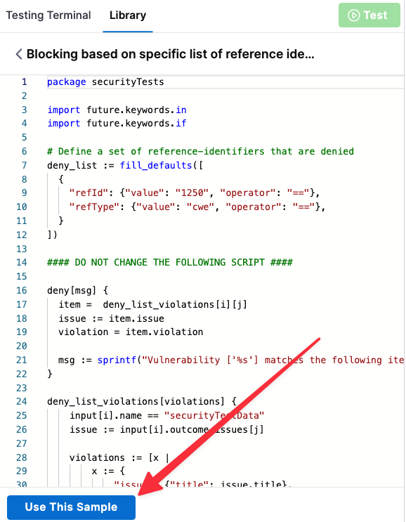 You must copy the entire sample code from the OPA policy library, as described in Create a new Security Tests OPA policy.